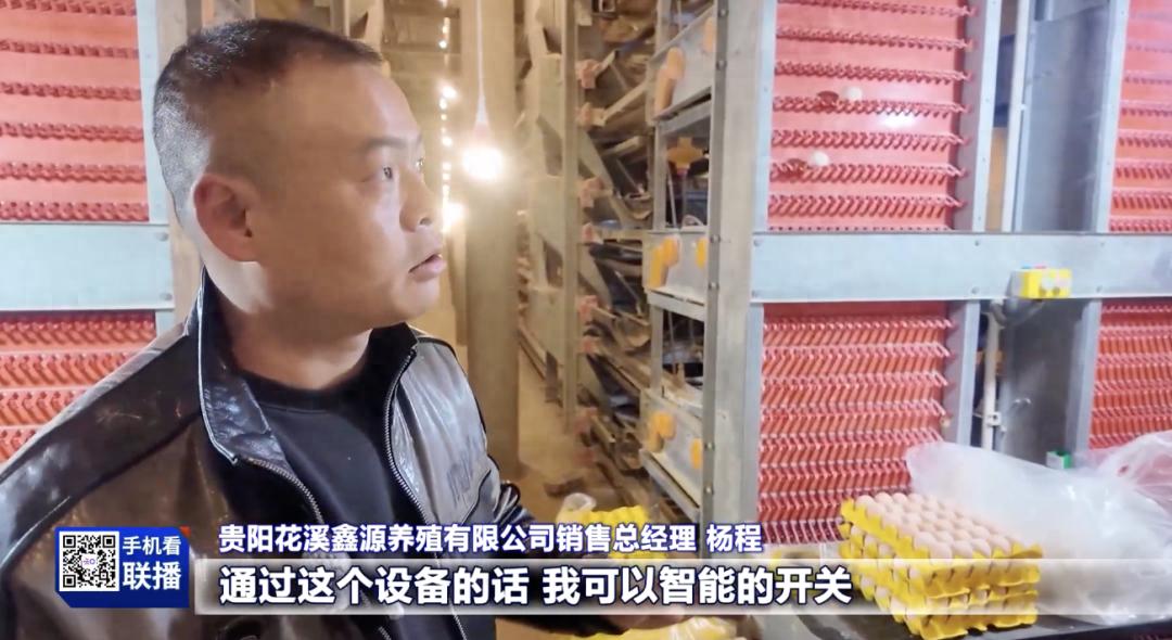 贵阳花溪鑫源养殖有限公司销售总经理 杨程:通过这个设备,我可以智能的开关,控制灯光、饮水,控制饲料的投料和鸡蛋的采集系统,后面还有风扇,相当于我们的鸡住了空调房。