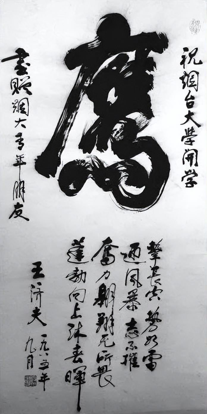 这是王济夫在烟台大学正式开学之际为首批学子的题词“鹰”,寄托了他对烟大学子的殷切希望!“击长空,势如雷,迎风暴,志不槯。奋力翱翔无所畏,蓬勃向上沐春晖。”