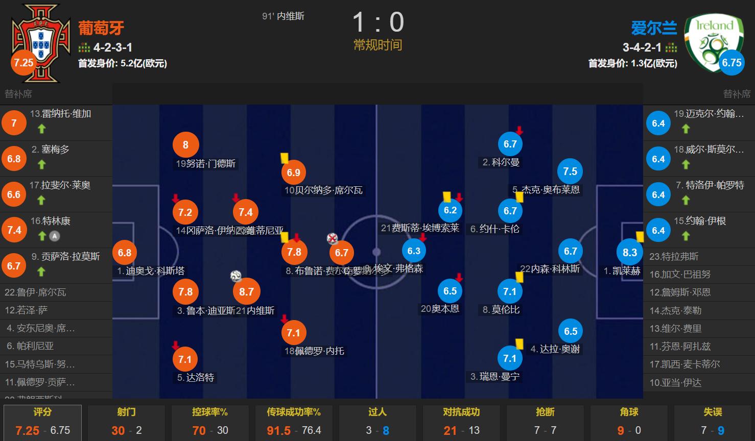 全场比赛,葡萄牙的控球率为七成,狂射30脚,其中6次射正;爱尔兰一共仅有2次射门,其中0次射正。葡萄牙首发最低分的C罗延续以往剧情,一人狂射7脚,又是全队最高,失点+哑火。C罗只要不进球基本上就沦为最低分,这才是葡萄牙目前面临最本质的难题,但C罗又不得不首发。