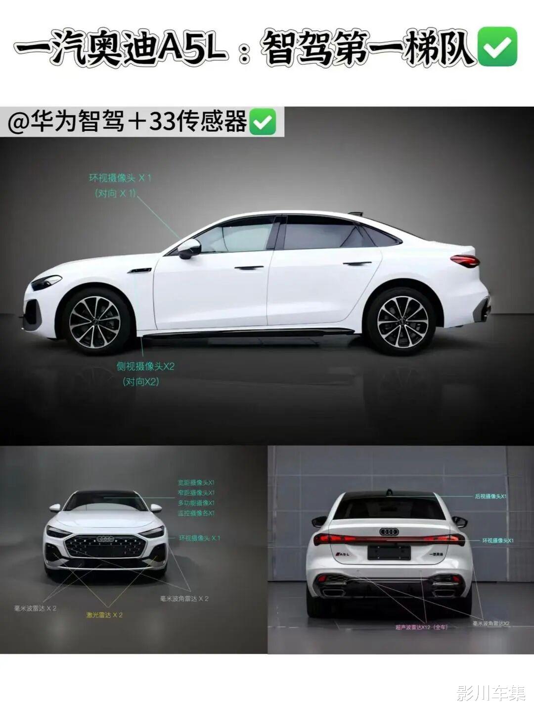 在最近刚刚上市的奥迪A5L上,华为的ADS智驾系统正式出现在了这台车上。在2026款的奥迪A5L 2.0T 乾崑智驾版上,标配了两颗激光雷达,6颗毫米波雷达,12个超声波雷达,另外还有12个车外摄像头以及一个车内摄像头。