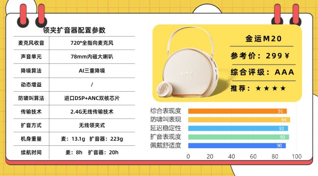 小蜜蜂扩音器哪个品牌好?对于追求轻便与降噪的用户,漫步者MF2无线领夹扩音器是不错的选择。其DSP智能降噪能有效过滤环境杂音,单指向麦克风聚焦人声,让扩音更纯净。2.4G 无线传输距离达20米,日常使用足够便捷,10g的重量携带和佩戴都很轻松,14小时续航可应对全天工作。不过,它不支持TF卡、录音和其他扩展功能,当需要播放预制音频或记录内容时,就无法满足需求,功能完整性有待提升。安利品牌3:金 运 M20无线领夹扩音器推荐指数:★★★★推荐语:心型指向麦克风确保声音采集精准,13.1g的重量佩戴无存在感
