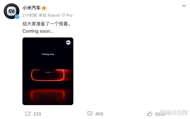 2月28日消息,小米汽车官方发布惊喜预告,配文“给大家准备了一个惊喜。Coming soon...”,小米集团创始人雷军
