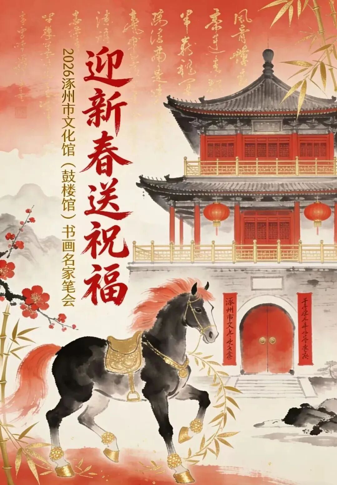 2026年2月7日-8日(腊月二十至廿一)在涿州市文化馆举办,无需报名、直接参与。书画名家李册、鲁汉、任东会、贯之、张葆冬现场泼墨传递新春祝福,市民可免费领取春联、福字;同时开展名家书画作品公益义卖,作品定价亲民,助推高雅艺术走进大众生活。