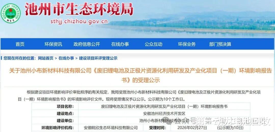 第一动力电池回收消息,近日,安徽省池州市生态环境局发布了关于池州小布新材料科技有限公司《废旧锂电池及正极片资源化利用研发及产业化项目(一期)环境影响报告书》的受理公示。