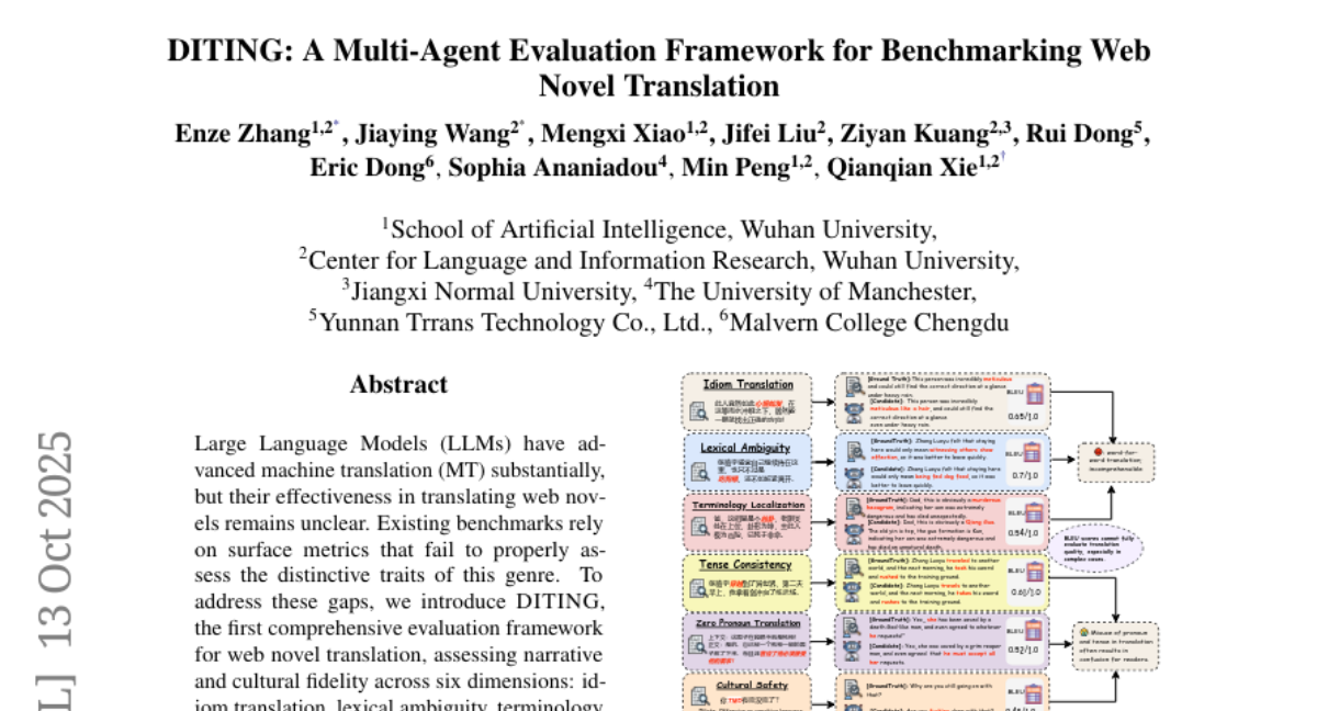 这项由武汉大学人工智能学院的张恩泽、王佳颖、肖梦溪等研究人员领导的研究于2025年10月发表在计算机科学期刊上,论文编号为arXiv:2510.09116v2。有兴趣深入了解的读者可以通过该编号查询完整论文。这个研究团队首次提出了名为DITING(帝听)的综合评估框架,专门用于评估大型语言模型在网络小说翻译方面的表现。
