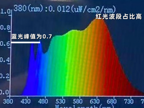 光谱是采用光谱仪对415-455nm的有害蓝光和670-700nm的有益红光进行测量和观察。