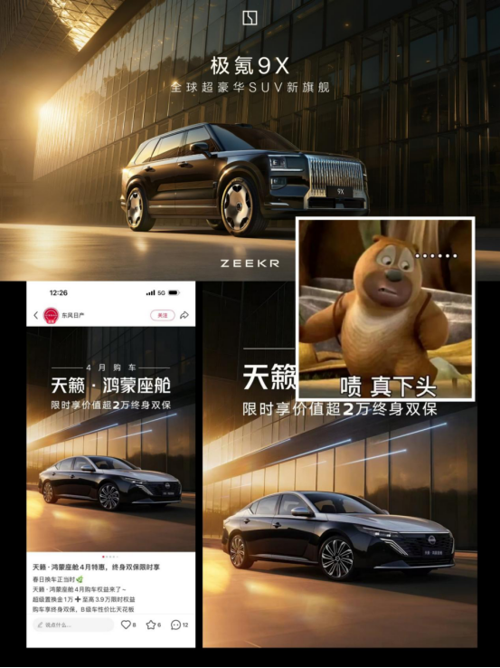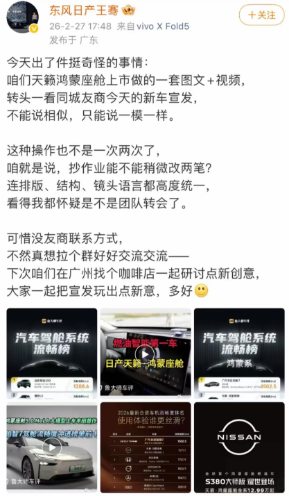 前些日子东风日产高管还在某社交平台暗讽别的厂商宣发抄袭,说人家排版、镜头语言跟自己家一模一样,还灵魂拷问“抄作业能不能改两笔”