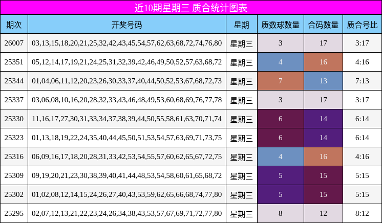 近10期星期三的质合数据显示,合数号码累计开出149个,质数仅51个,比例高达149:51,合数明显占据主导地位。上期开出3个质数,17个合数,延续了合数偏热的格局。从趋势看,质数连续多期偏冷,当前已有回暖迹象,但整体仍处于低位。本期预计质数将小幅回升,推荐02,23,31作为质数关注点,合数则继续以04,06,10,16,18,21,22,25,27,28,30,32,33,36,42,45,48为主力支撑。