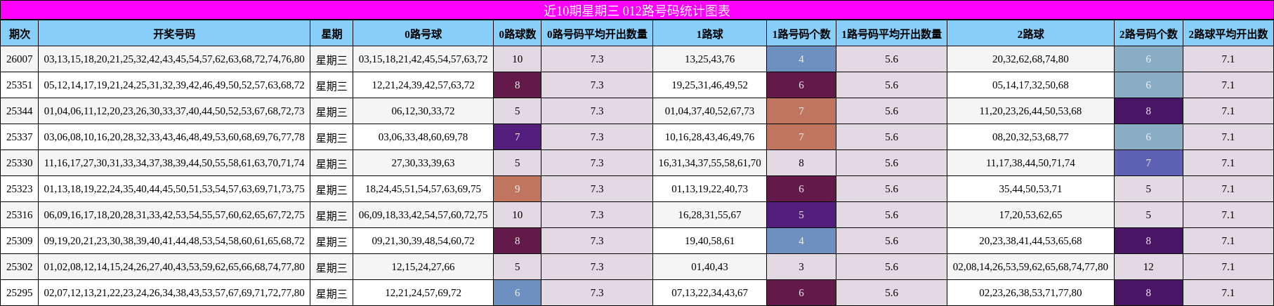 012路分布:0路强势回归,2路持续低迷从近10期星期三的012路统计来看,0路号码平均每期开出7.3个,2路7.1个,1路5.6个,0路与2路明显高于1路。尤其值得注意的是,0路在近10期中占比达40%,远超1路的30%,显示出极强的稳定性与热度。上期0路开出5个,1路6个,2路9个,2路略显活跃,但整体仍处于低位。