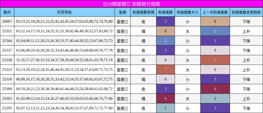 图中显示,和尾在第26010期后连续出现“下降-下降-上升”组合,说明趋势正在酝酿反转。若本期和尾上升至9,将形成“连续三连升”格局,符合近期走势的潜在转折点。