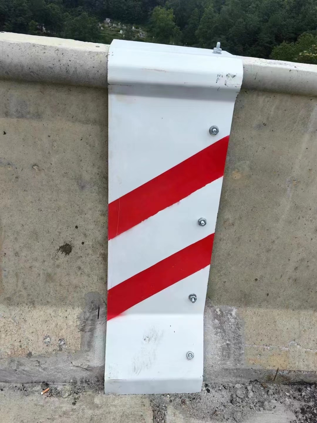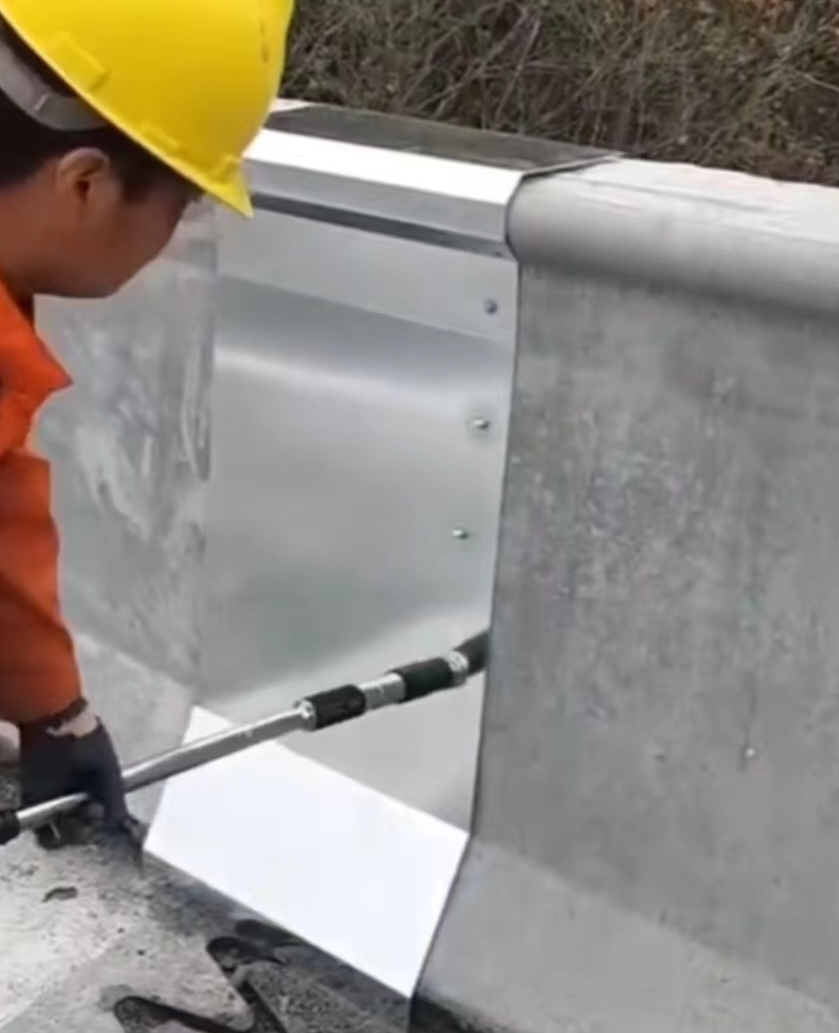 首先是基础防护作用,能有效阻挡砂石、泥土、生活垃圾等杂物进入伸缩缝缝隙,避免伸缩装置型钢、胶条出现卡滞问题,保障桥梁梁体自由伸缩的变形功能;同时隔绝雨水、雪水及融雪剂溶液,防止水汽渗入伸缩缝内部造成钢结构锈蚀、混凝土基座酥松破损,从源头减少伸缩缝病害。其次是防撞与行车安全防护,防撞墙护栏处的伸缩缝挡板与护栏结构无缝贴合,既适配伸缩缝的变形需求,又补充了防撞墙的防护完整性,防止车辆撞击护栏时,碎片进入伸缩缝或剐蹭外露的伸缩缝部件,同时避免伸缩缝部件因车辆剐蹭、冲击出现变形,提升高速公路桥梁的行车安全系数。