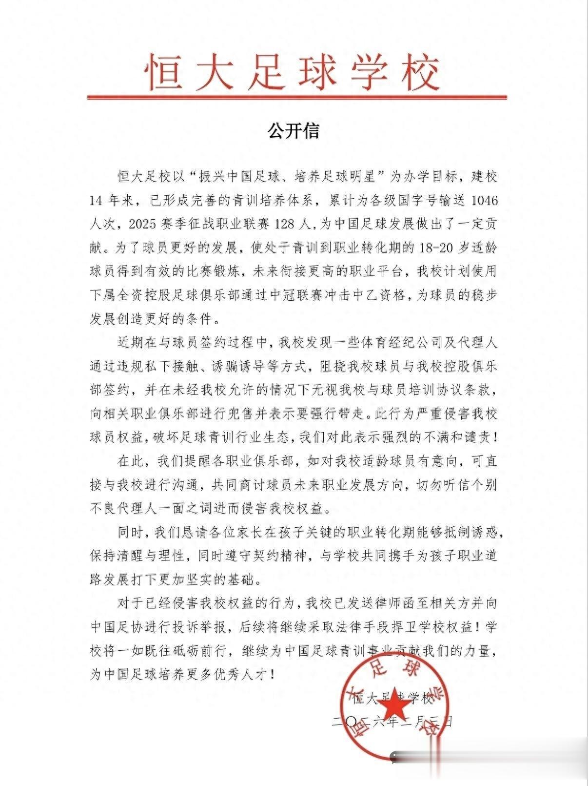 公告中也写到:“近期在与球员签约过程中,我校发现一些体育经纪公司及代理人通过违规私下接触、诱骗诱导等方式,阻挠我校球员与我校控股俱乐部签约,并在未经我校允许的情况下无视我校与球员培训协议条款,向相关职业俱乐部进行兜售并表示要强行带走。此行为严重侵害我校球员权益,破坏足球青训行业”