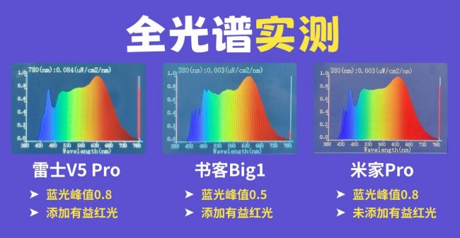 实测方法说明:在同一暗室环境下,统一色温与亮度档位,使用光谱分析仪分别采集三款台灯的光谱分布,重点关注蓝光峰值位置以及是否存在红光补偿。
