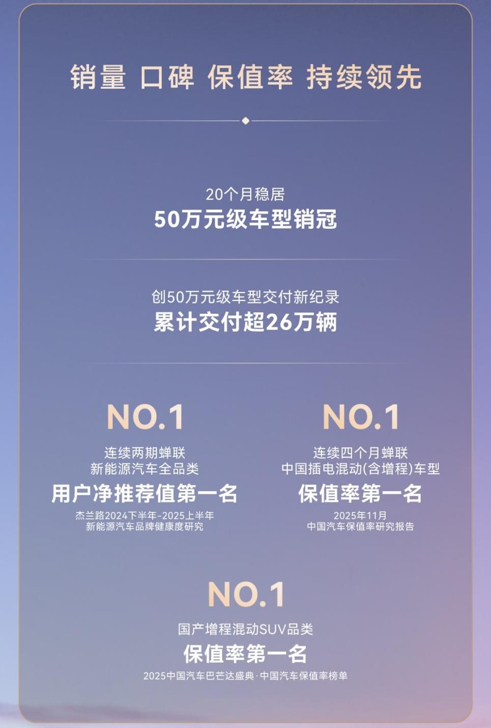 除了销量与交付量持续攀升,问界M9更以净推荐值、保值率双第一的成绩,稳坐豪华汽车市场标杆席位。在中国汽车流通协会发布的《2025年11月中国汽车保值率研究报告》中,问界M9已连续四个月蝉联中国插电混动(含增程)车型保值率第一,并在2025中国汽车巴芒达盛典“中国汽车保值率榜单”中位列国产增程混动SUV第一,展现50万级豪华车价值新高度。在杰兰路2024下半年-2025上半年新能源汽车品牌健康度研究中,问界M9连续两期获得新能源全车型用户净推荐值第一。此外,在中国质量协会发布的2025年中国新能源汽车行业用户满意度指数评测结果中,问界M9荣获第一名,并在J.D. Power 魅力指数榜单中位列豪华插电混动SUV第一……这一系列殊荣,共同印证了这款现象级产品在新能源豪华车市场的标杆实力。