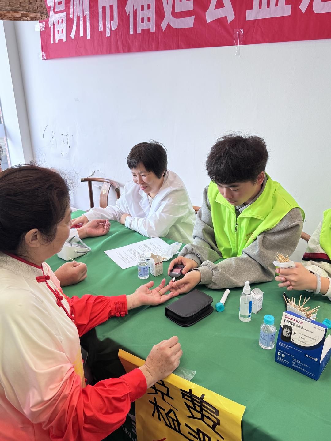 福建省妇幼保健院苏彦钊、福延公益志愿者服务总队负责人李颂超为当地老人义诊,测量血糖。