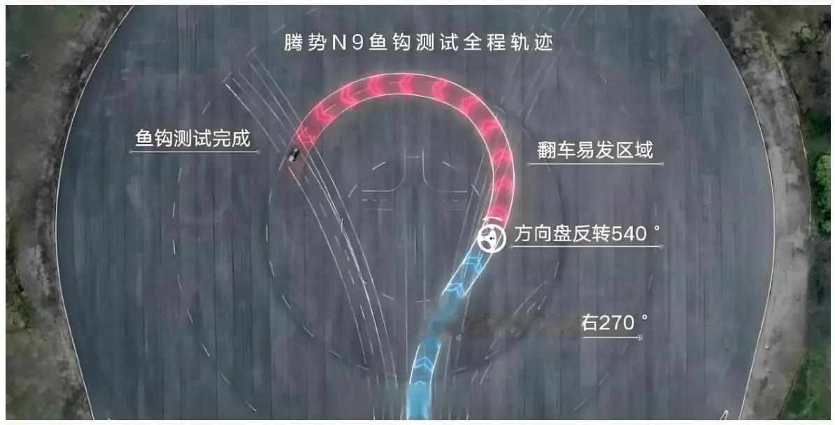 “鱼钩测试” 作为车辆防侧翻能力的 “终极大考”,模拟的是高速行驶中躲避突发障碍物的危险场景,高重心的大型 SUV 在此类场景下极易因离心力失控侧翻。此前,全球顶级车企多以达标为目标,而 2026 款腾势 N9 却突破传统机械极限,在 210km/h 高速连续猛打方向时,仍能保持四轮紧抓地面、车身姿态稳定,将 “高速避让安全不侧翻” 从理想变为现实。