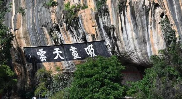 还未走近,四个plus版的繁体字——“吸尽云天”就以超大的身形向我们“打招呼”了。横平竖直,迥劲有力,刻于崖壁之上,气贯长虹之势,仿佛真能“吸尽云天”。