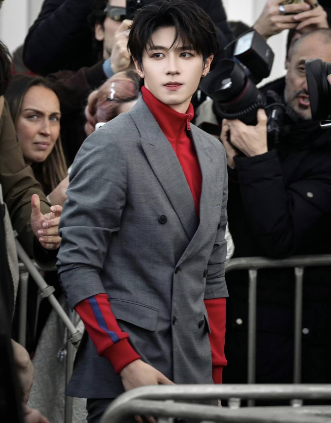 TOP登陆少年队长朱志鑫身着灰色双排扣西装,内搭一抹亮眼的中国红高领拉链衫,以“浓烈与克制”的撞色造型亮相2026米兰时