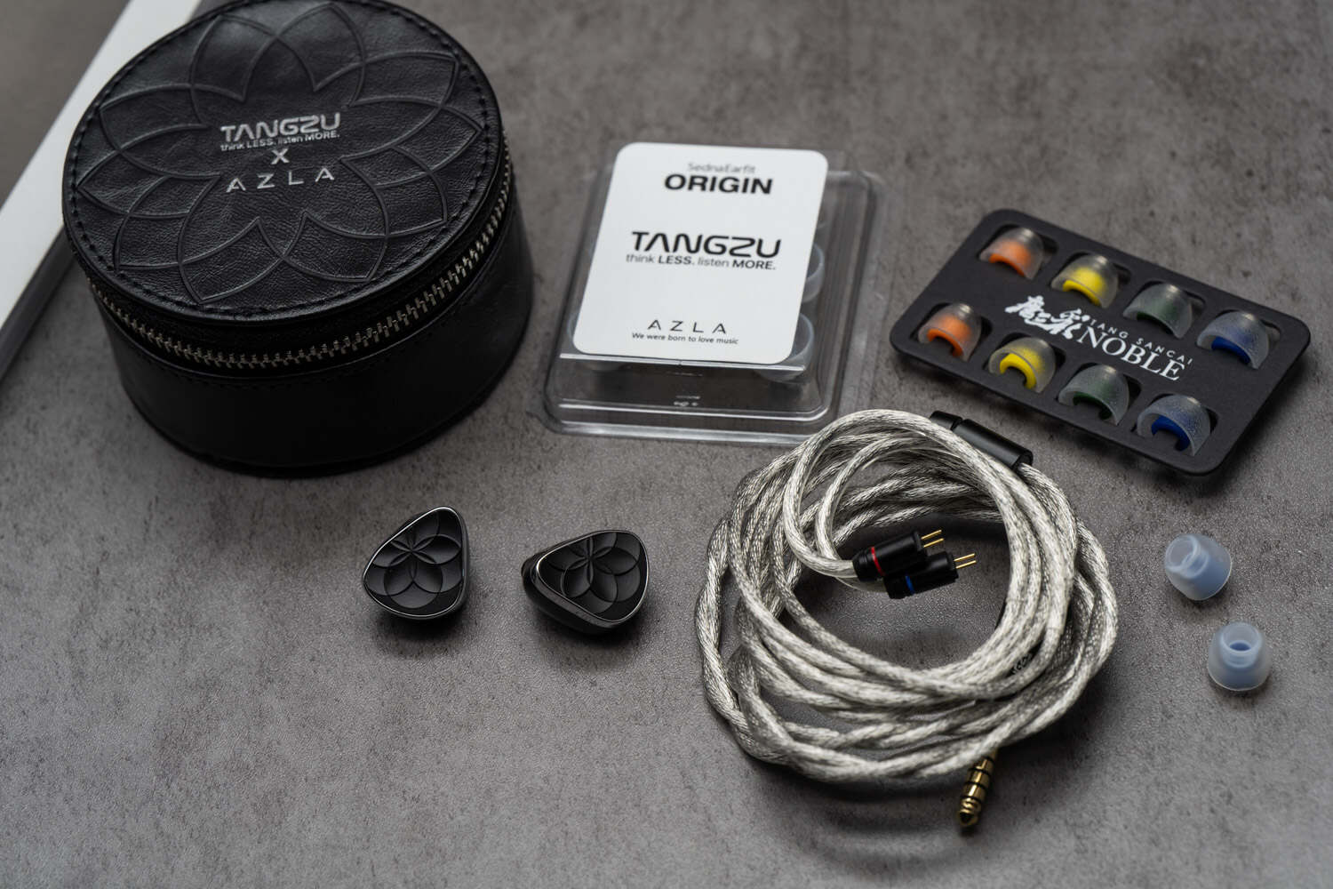 Noir Blanc是一条一圈三铁的入耳耳塞,体型小巧,设计漂亮。系由国内耳机品牌唐族和韩国耳机配件品牌AZLA联名推出,个人觉得不论从哪方面来看都不太像唐族的产品,也打破了唐族产品命名都围绕中国古代(包括神话)人名为主的惯例,算是唐族耳机产品线中比较“另类”的一款产品。作为和“耳套大厂”AZLA联名的产品,Noir Blanc自然得配上AZLA的耳套,标配附送了AZLA的ORIGIN耳套,这款耳套偏重均衡还原的声音表现(详情可参阅我之前写过的评测:HiFi入耳耳机的“末端调音”利器——AZLA的六款发烧级耳塞套);此外唐族自家的唐三彩贵族版耳套也没有缺席。除了声音上存在差异,这两款本身都是耳套中的上品,可针对不同用户的耳道深度和佩戴习惯(深OR浅)适配不同的烧友。而标配的线材为单晶铜镀银的可换插头线材,自带3.5和4.4插头可供拆换,适用于不同的播放设备。