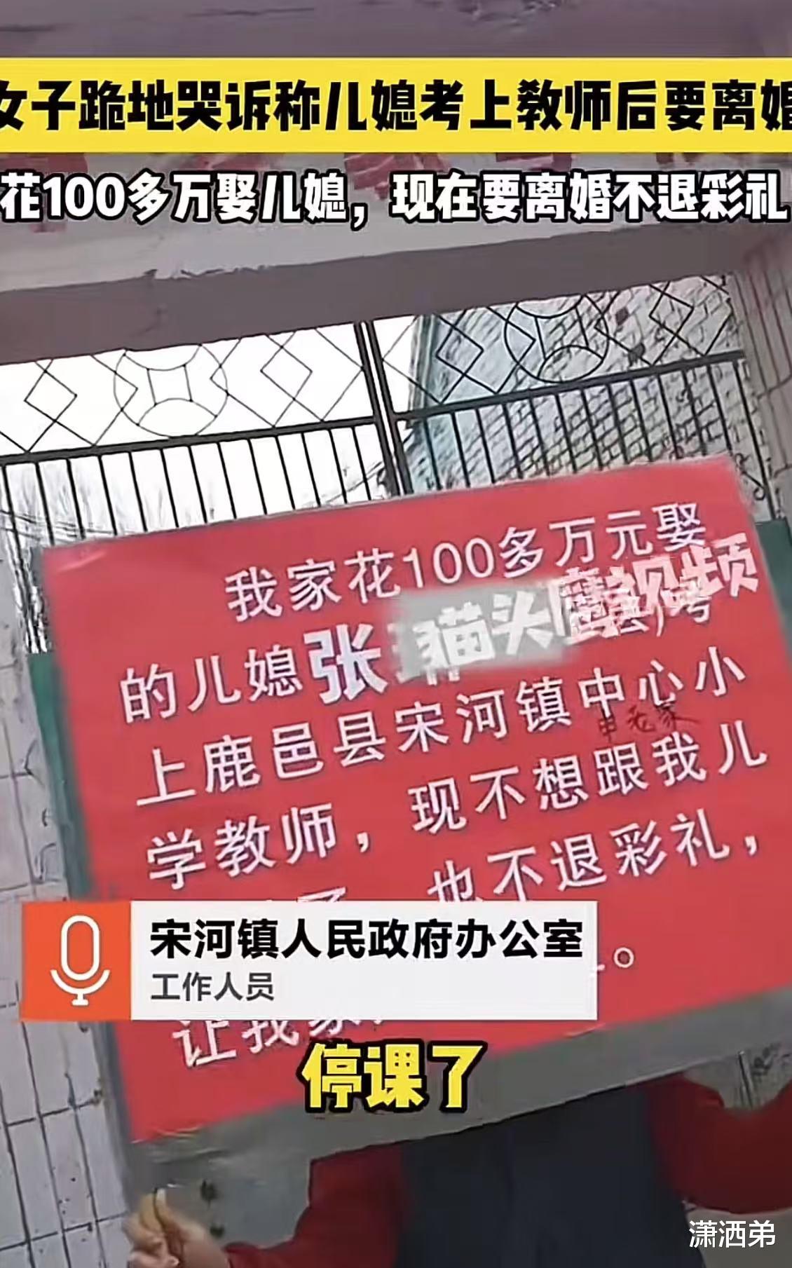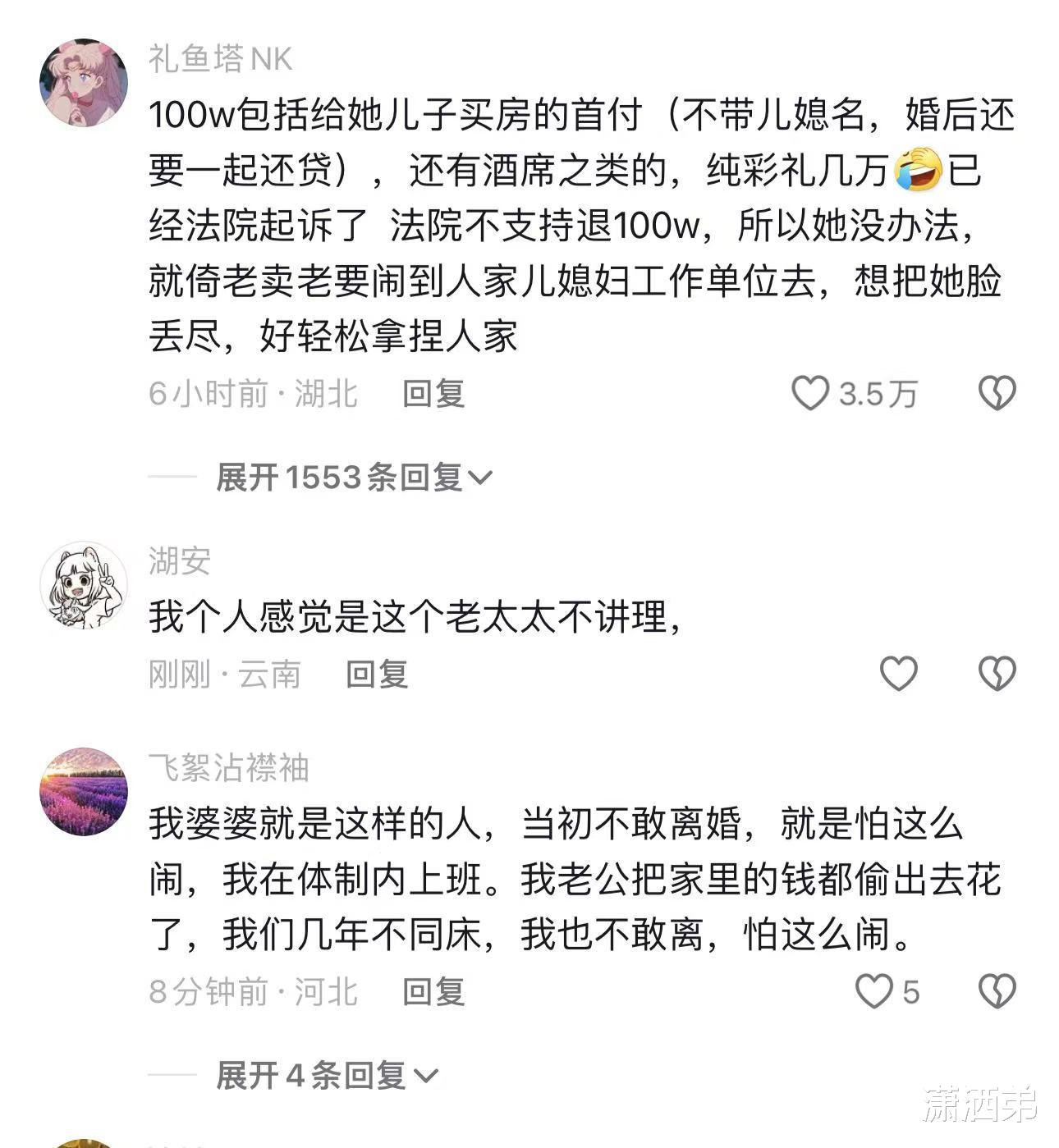 评论区有知情人士表示这一百多万是包括给他儿子买房子首付的钱,还不带儿媳名字婚后要一起还贷。还有酒席什么的,纯彩礼就几万。要退的话就只能退这几万块的彩礼,但婆婆要求对方退100万或者不离婚,法院也没有办法支持婆婆无理取闹的要求,所以婆婆才来到校门口闹,想把儿媳脸丢光,好轻松拿捏对方。