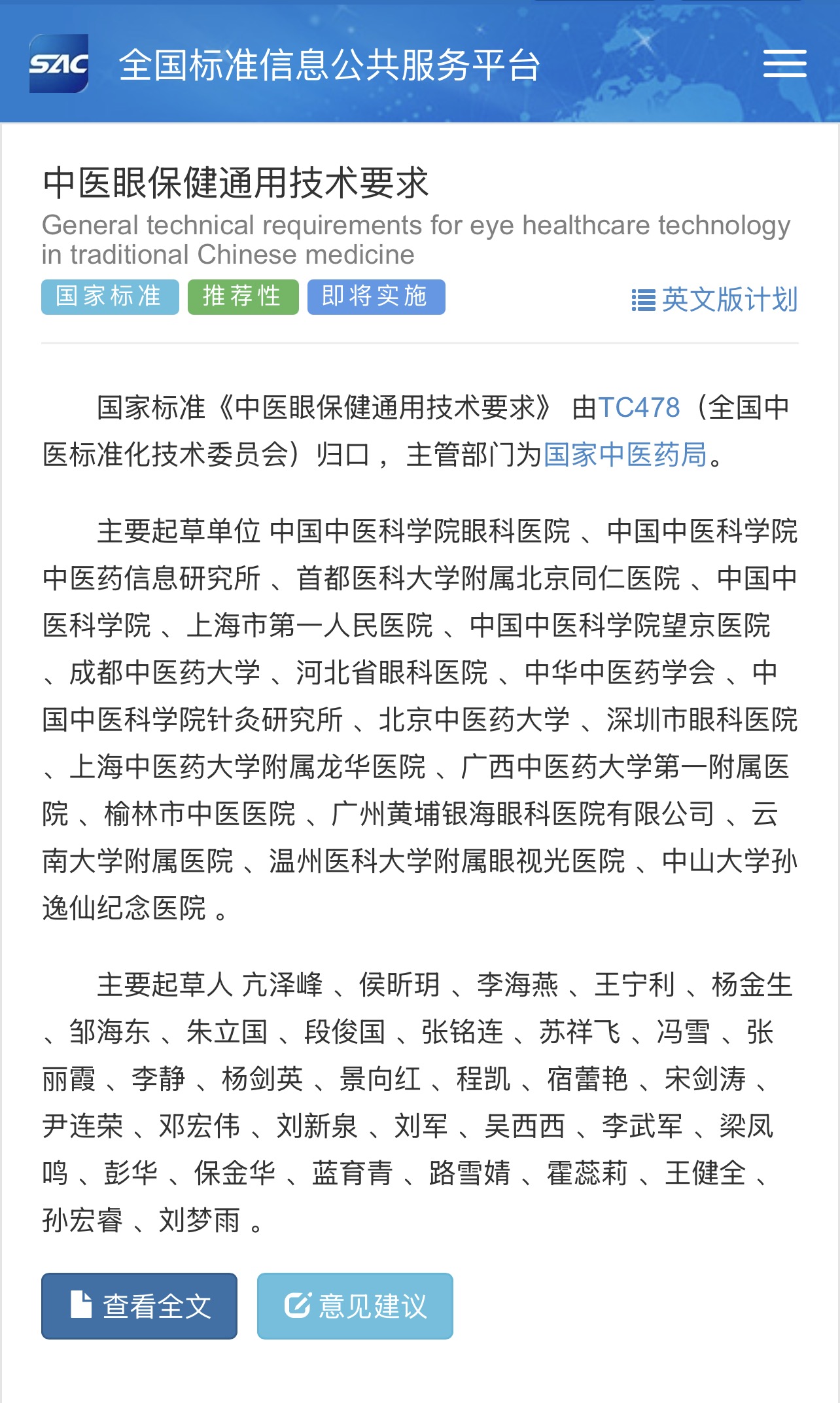 全国中医标准化技术委员会副主委、中国工程院院士朱立国曾指出,中医药标准化是引领中医药高质量发展的重要路径,该标准的立项与发布,将极大提升中医眼保健技术的服务能力和水平,增强全社会对眼健康的认知。