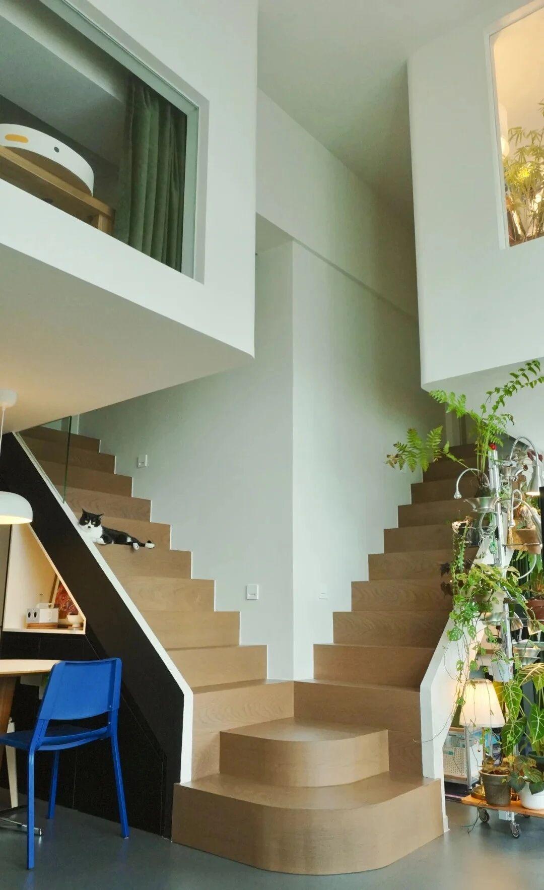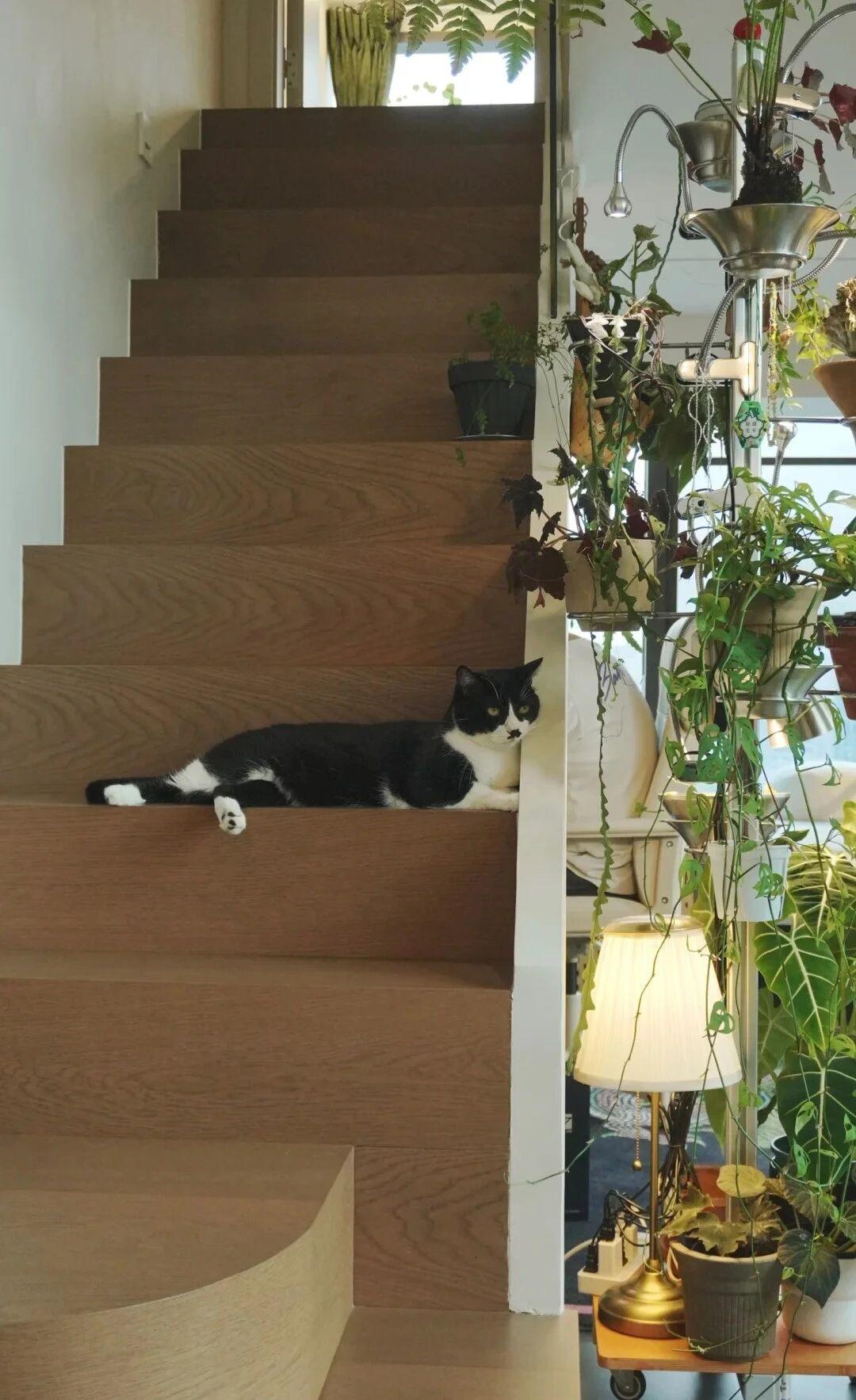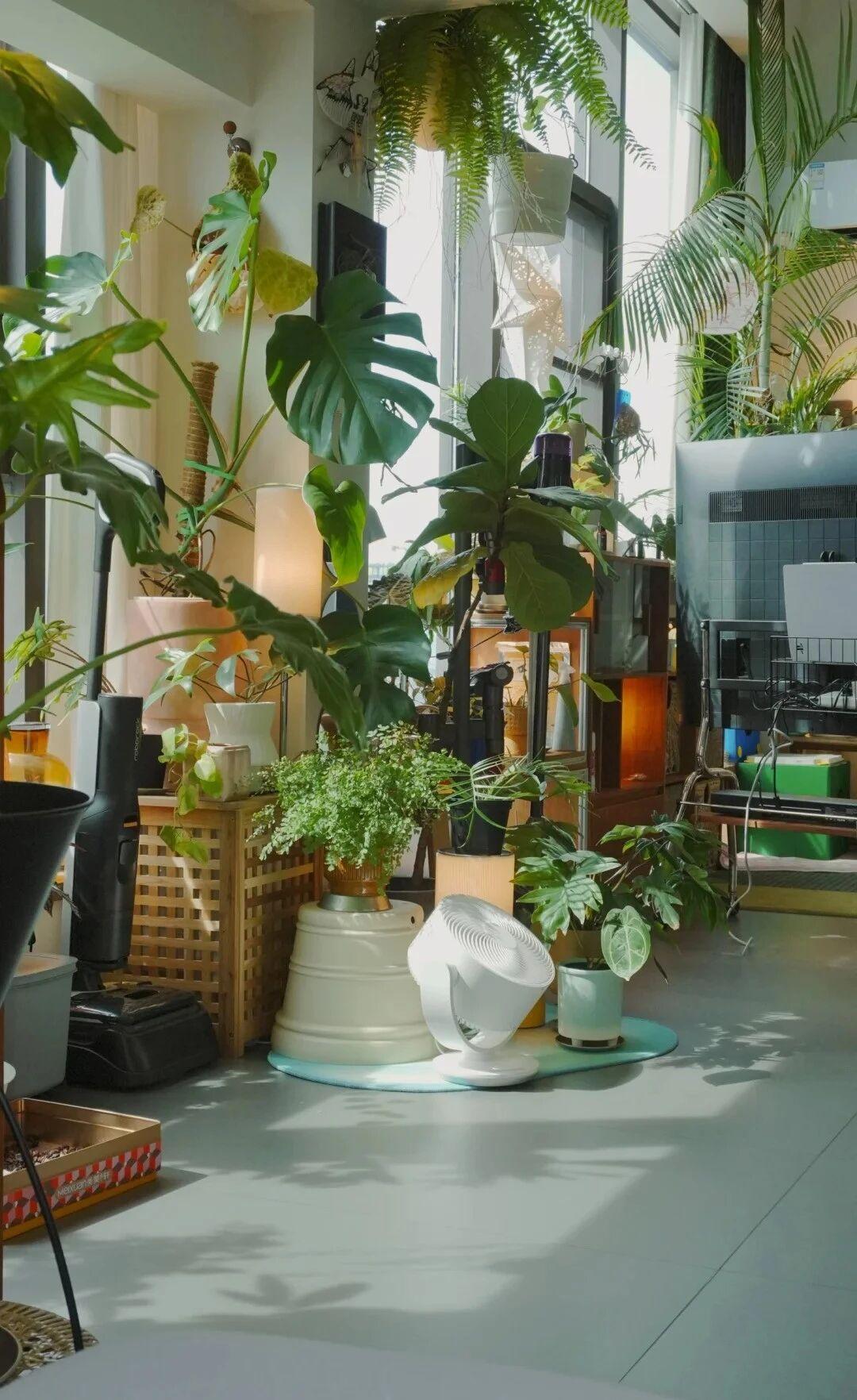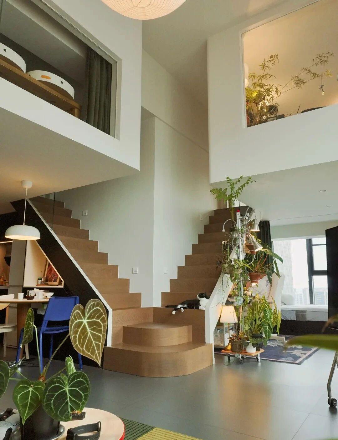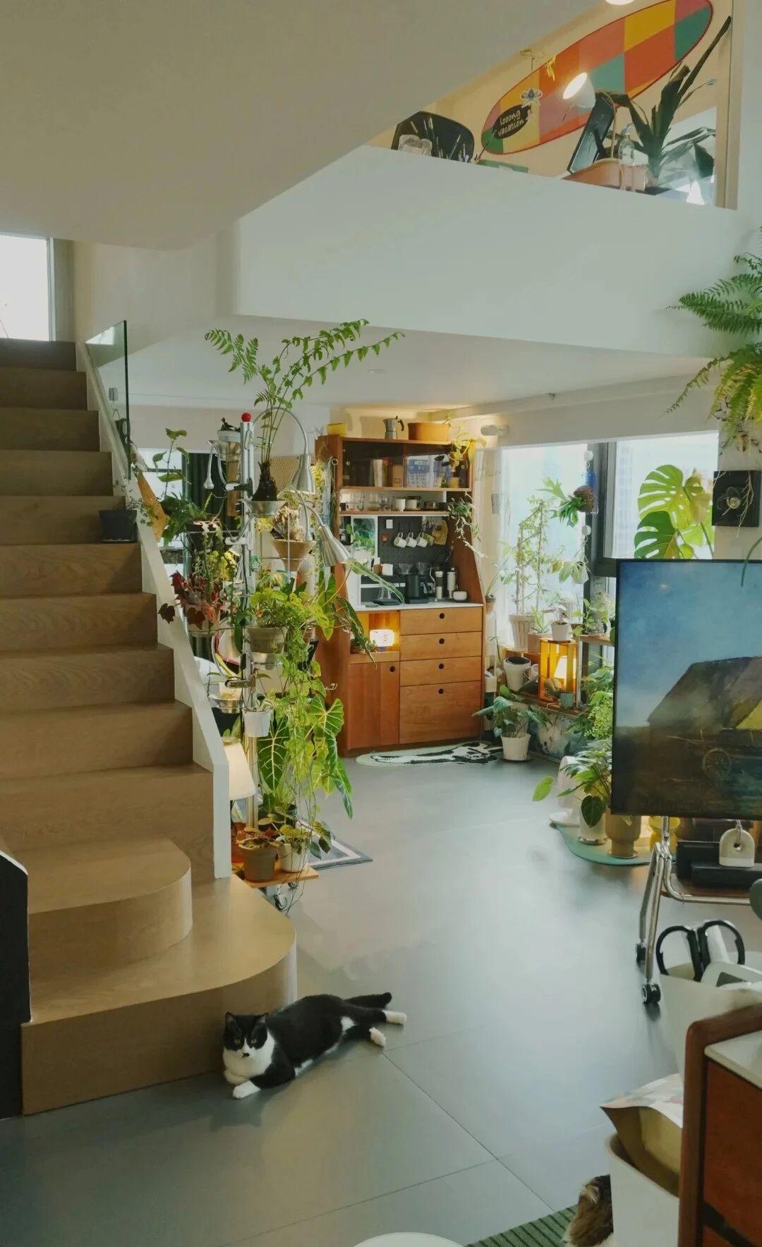 几乎每个功能区,都有植物,地面上摆放的是龟背竹、春羽、绿萝、蔓绿绒等观叶植物,楼梯扶手旁则设置了多层花架上,密集摆放一堆花草;