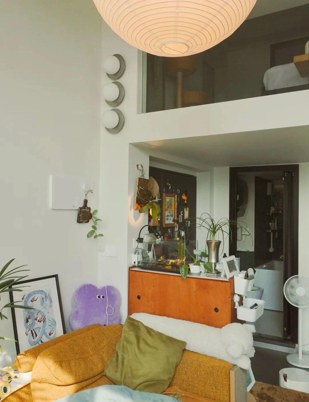 为了增加美感,博主特别在挑空空间,墙面挂着一块彩色拼接冲浪板,并在周围摆放着绿萝、蔓绿绒等绿植,还在最顶部,悬挂着一盏圆形白色吊灯,无论是白天还是晚上,这个区域都可以给予博主满满的松弛感。
