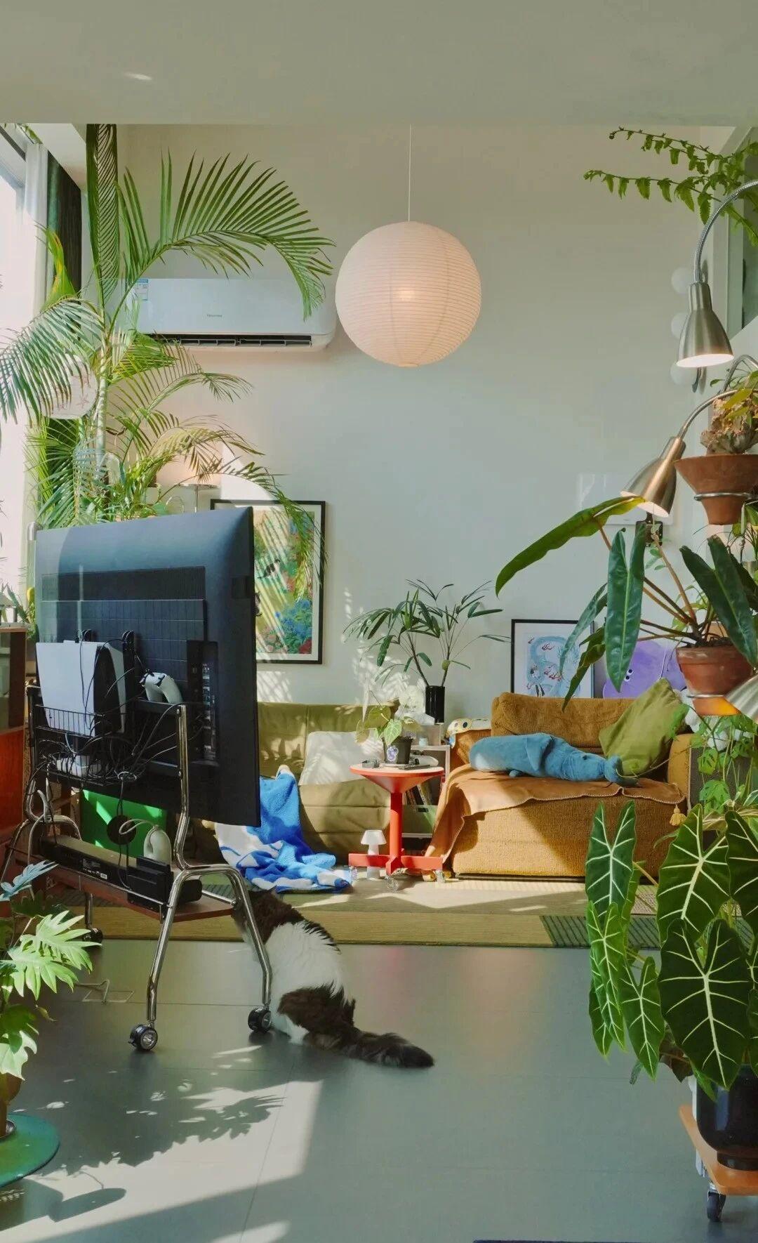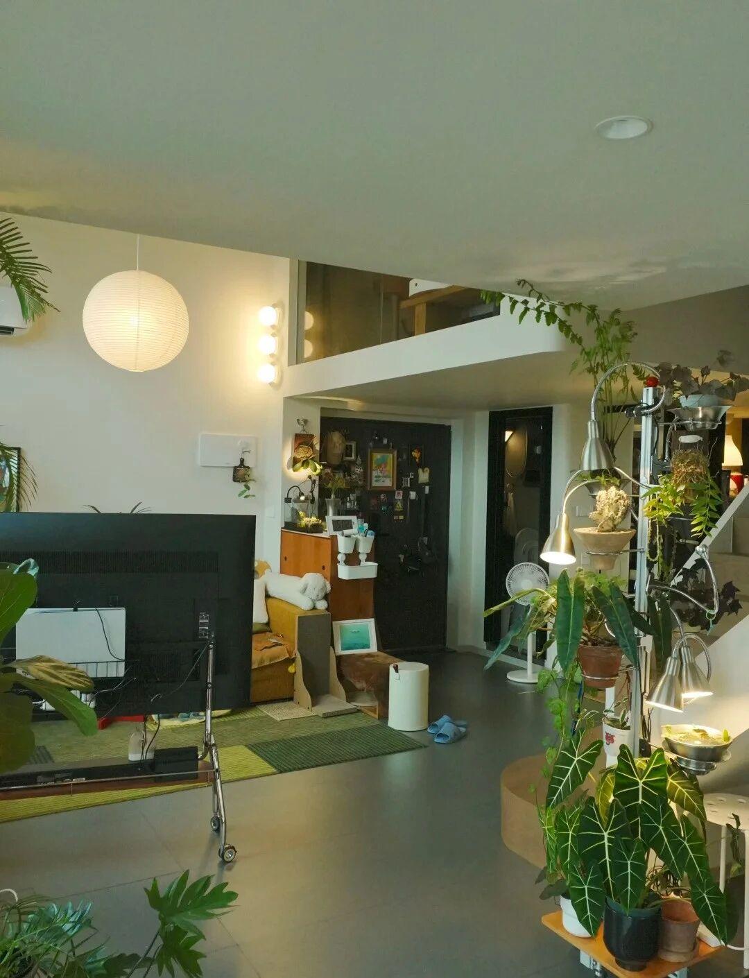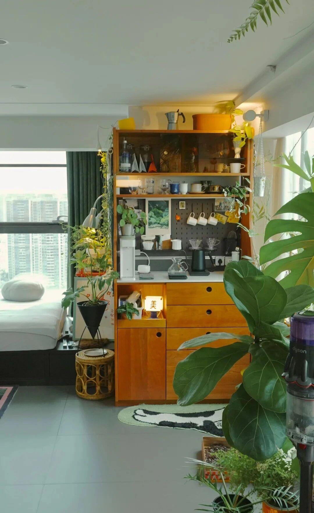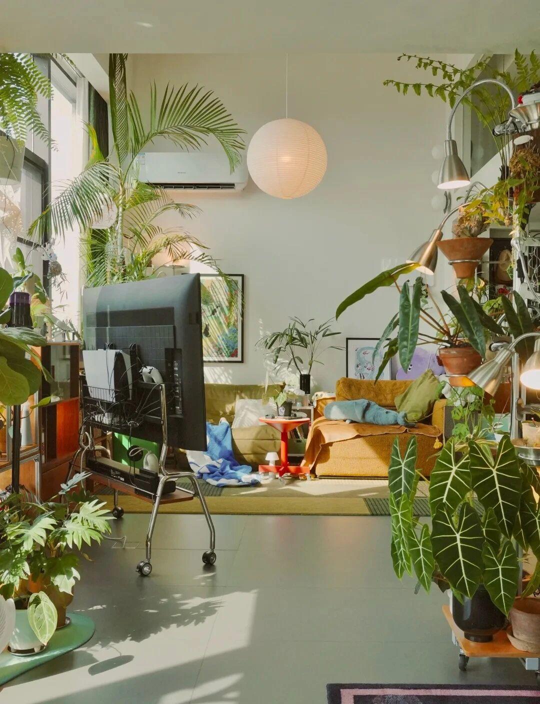 咖啡角、电视区域旁置物架,就连墙壁的垂直空间也没有浪费,绿萝、常春藤等植物悬挂于墙面,还有一些放在带轮花架上,满满当当,搭配氛围灯,美好生机。