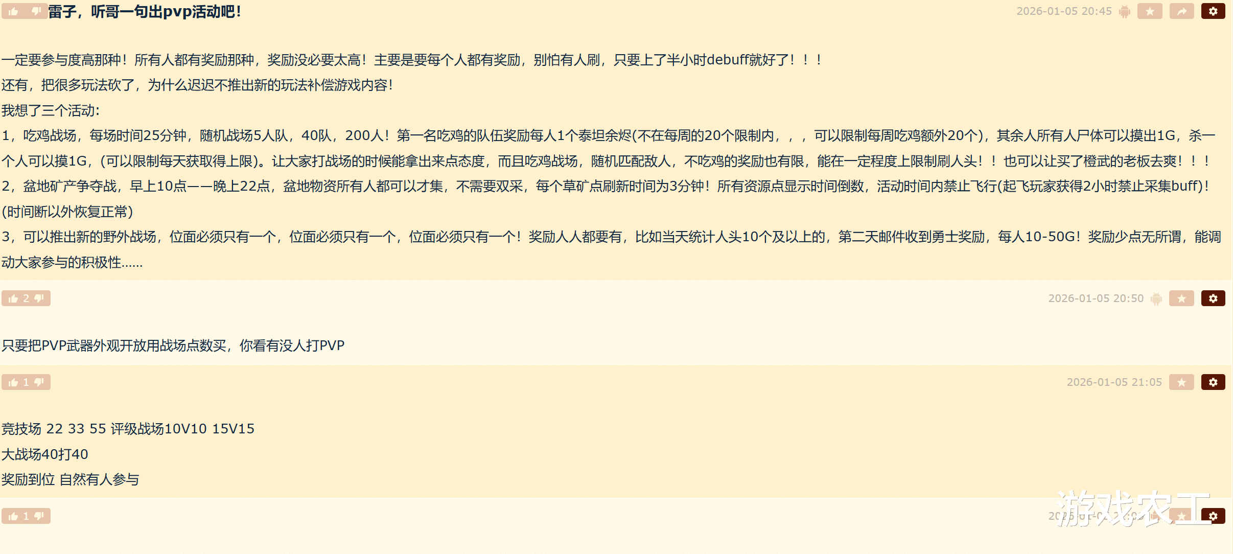 不过也有玩家回帖说其实要想激活PVP的人气很简单,只需要将PVP武器外观开放,然后用战场点数去购买,这样打PVP的人数直接上去了,甚至不仅仅是PVP装备可以,非PVP装备也可以,因为时光服中已经取消韧性,所以大家不是不打PVP,是目前阶段打PVP的收益过低,所以劝退了不少玩家,只要雷火奖励跟上那么玩家就会跟上。