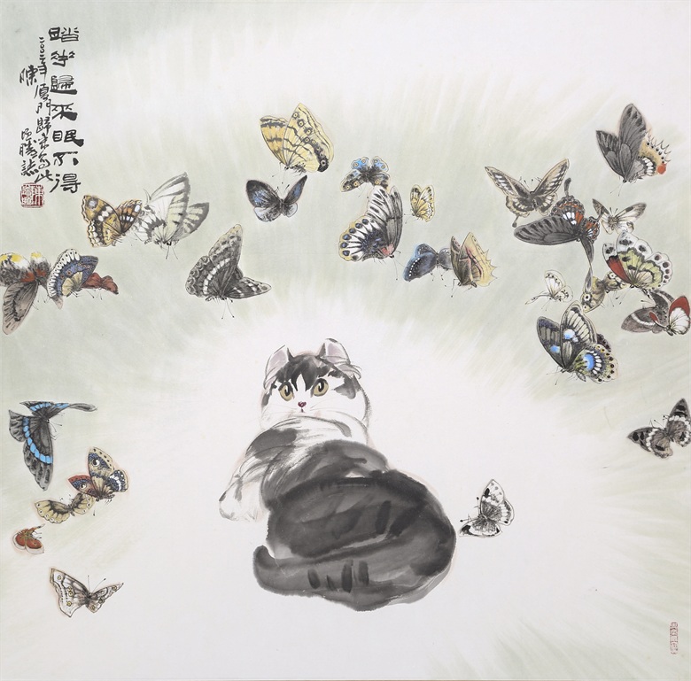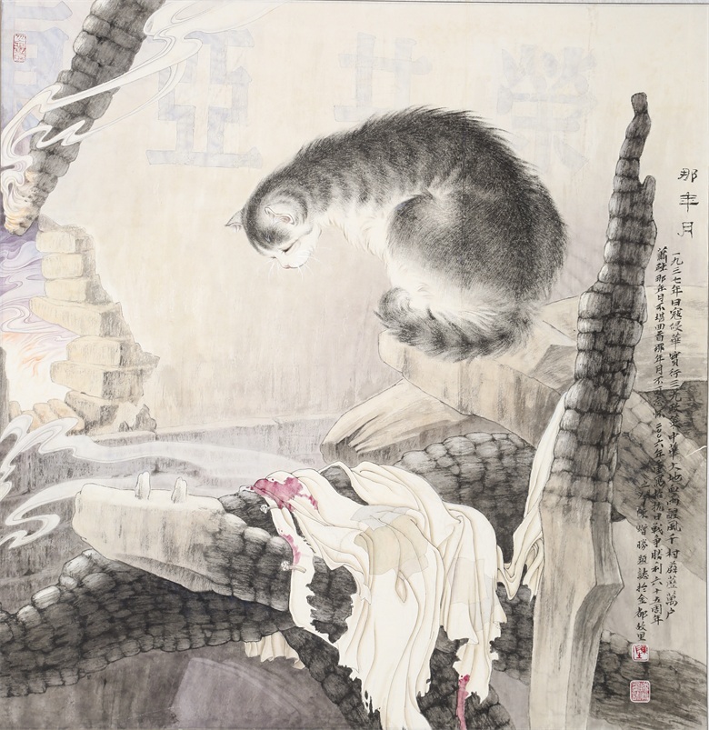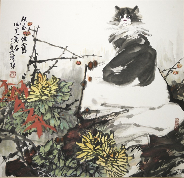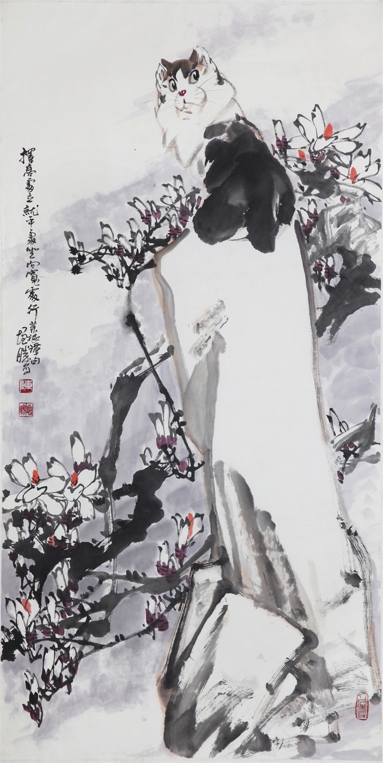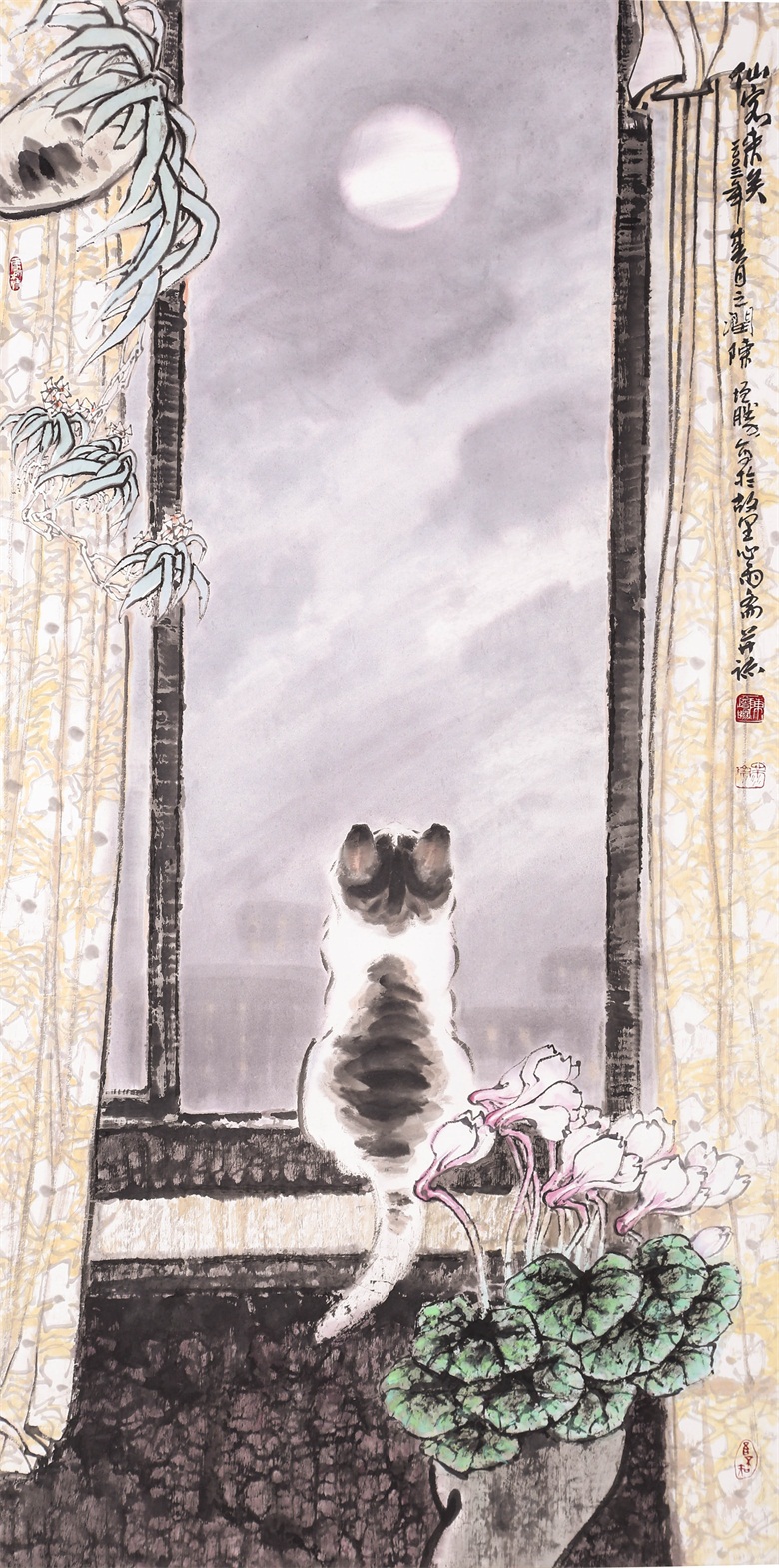 再比如陈增胜画的猫,或悠然、或闲适、或安详,笔趣妙意横生,墨韵淋漓酣畅,而笔趣、墨韵等传统墨分五色的表现手法与透视、造型、光影、色彩等新时代表现语言交相辉映,既有传统的笔情墨趣,又彰显了时代特色,最妙绝的是,陈增胜总是把猫与场景结合起来,让观者的视觉随着猫与场景的关系而情随意遣。画面中,猫如人,观者如猫,猫走进人的场景,人走进猫的世界,强烈的带入感吸引着观者走进去,聆听猫与天籁、地籁、物籁的声音,感受意境的无穷。正因如此,陈增胜的猫与刘继卣、曹克家、孙菊生的猫有一拼,又有一别,有一拼是异曲同工之妙,而有一别则是风姿绰约地独特,那独特属于陈增胜的技术,也属于陈增胜的艺术,更属于陈增胜的心性。