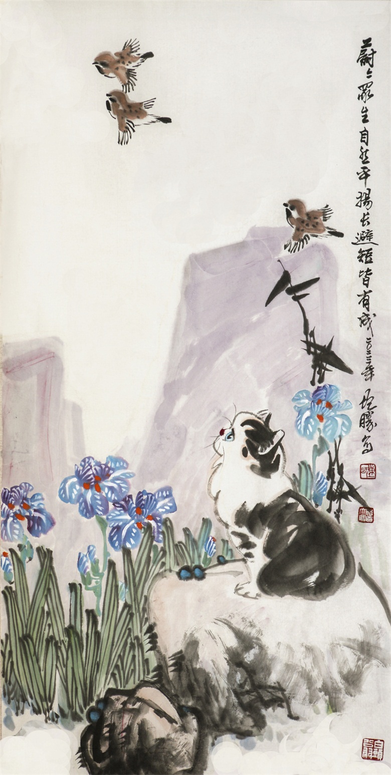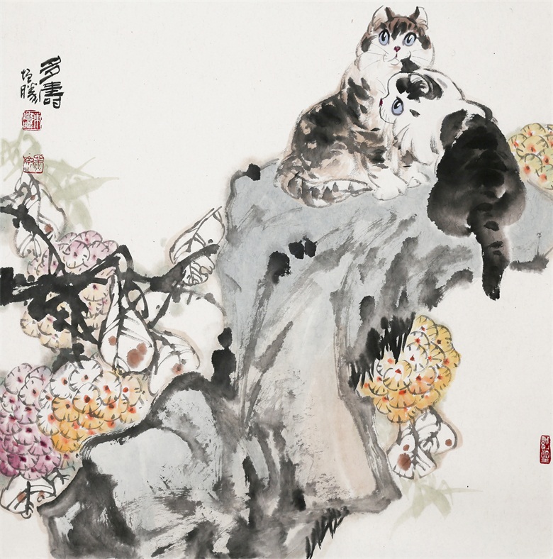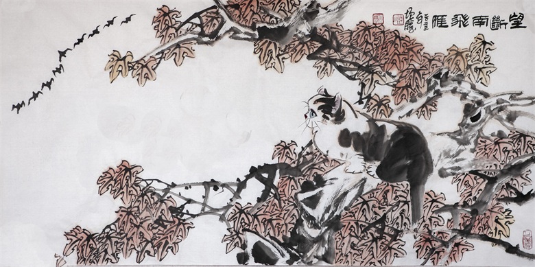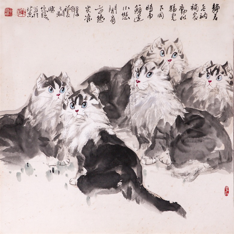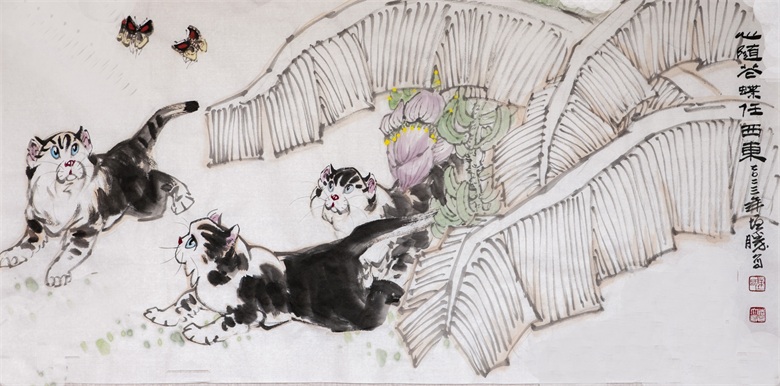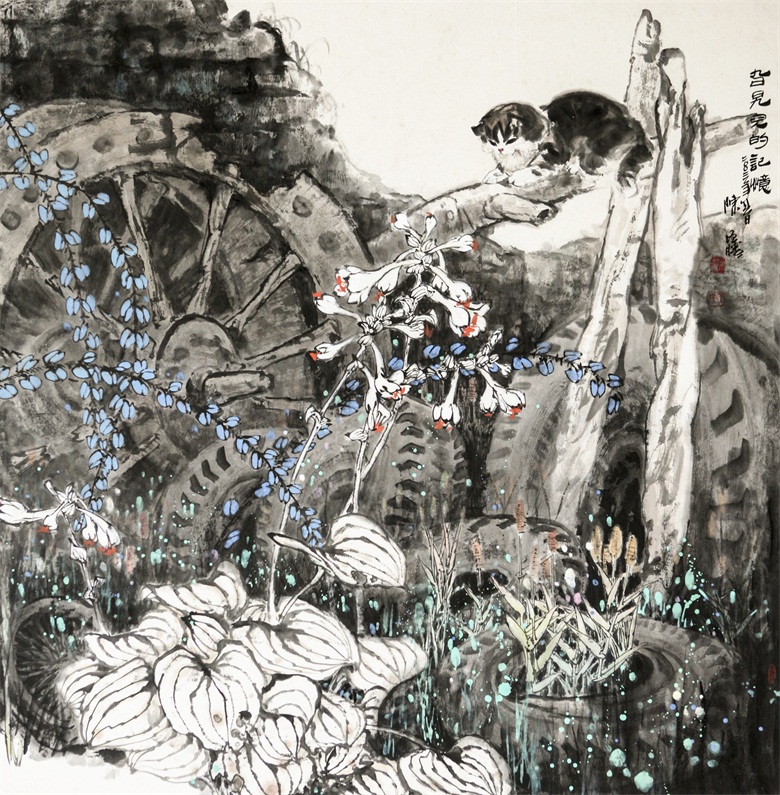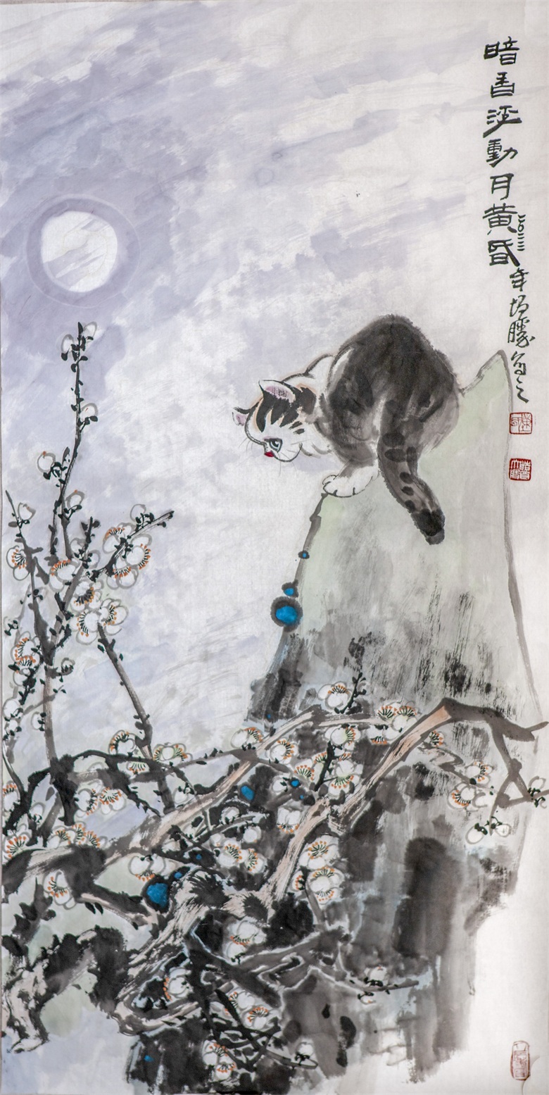 再比如陈增胜画的猫,或悠然、或闲适、或安详,笔趣妙意横生,墨韵淋漓酣畅,而笔趣、墨韵等传统墨分五色的表现手法与透视、造型、光影、色彩等新时代表现语言交相辉映,既有传统的笔情墨趣,又彰显了时代特色,最妙绝的是,陈增胜总是把猫与场景结合起来,让观者的视觉随着猫与场景的关系而情随意遣。画面中,猫如人,观者如猫,猫走进人的场景,人走进猫的世界,强烈的带入感吸引着观者走进去,聆听猫与天籁、地籁、物籁的声音,感受意境的无穷。正因如此,陈增胜的猫与刘继卣、曹克家、孙菊生的猫有一拼,又有一别,有一拼是异曲同工之妙,而有一别则是风姿绰约地独特,那独特属于陈增胜的技术,也属于陈增胜的艺术,更属于陈增胜的心性。