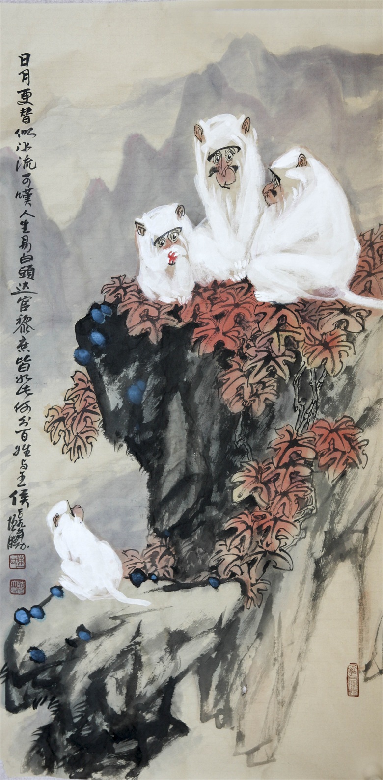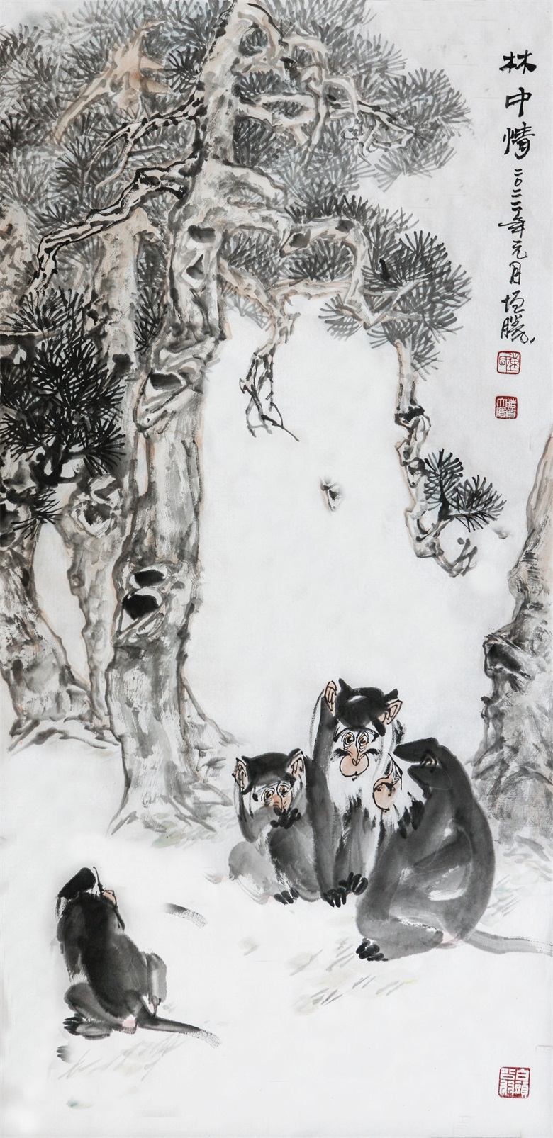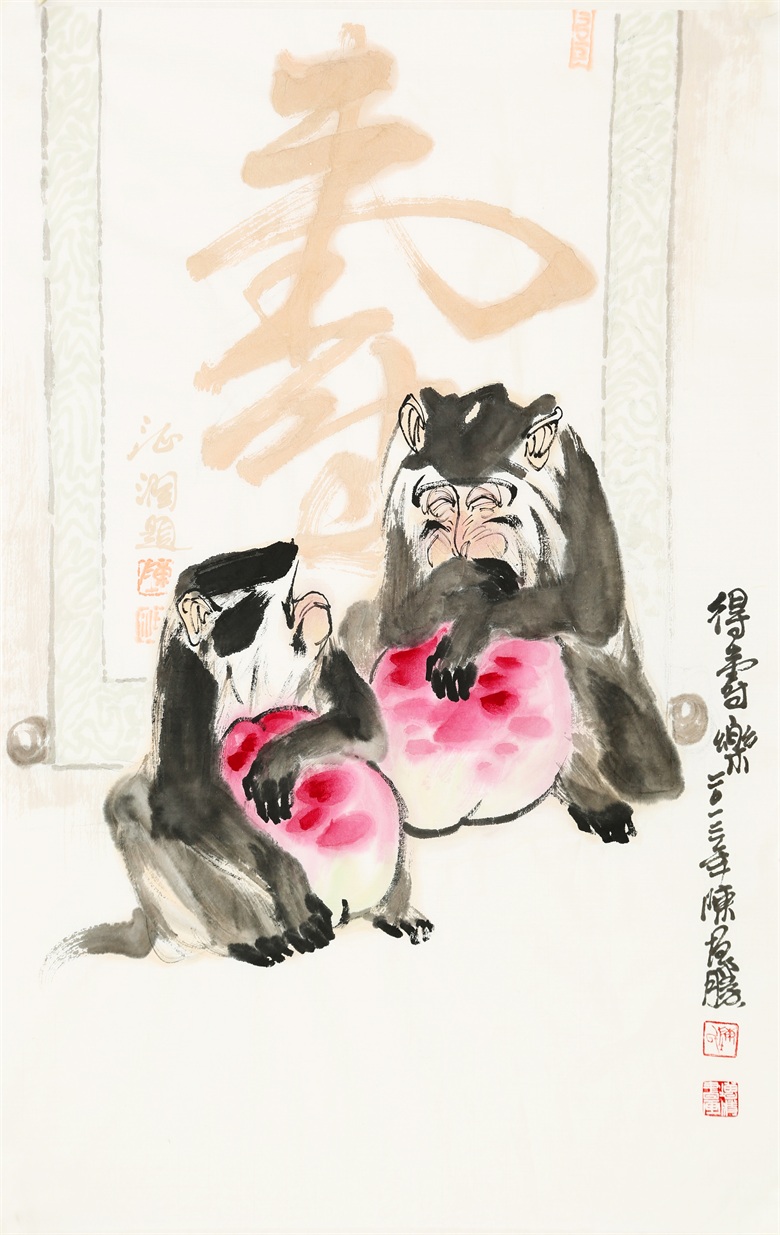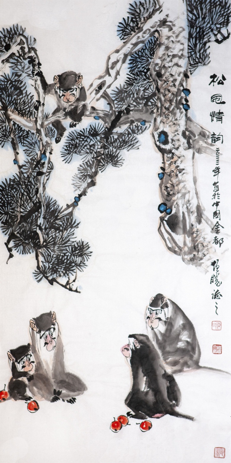 比如陈增胜画的灵猴,或憨态可掬、或聪明伶俐、或警觉敏锐,一幅幅活灵活现,呼之欲出,笔墨交融着心性,以形写神,则神形兼备,以神写形,则形尽其妙。
