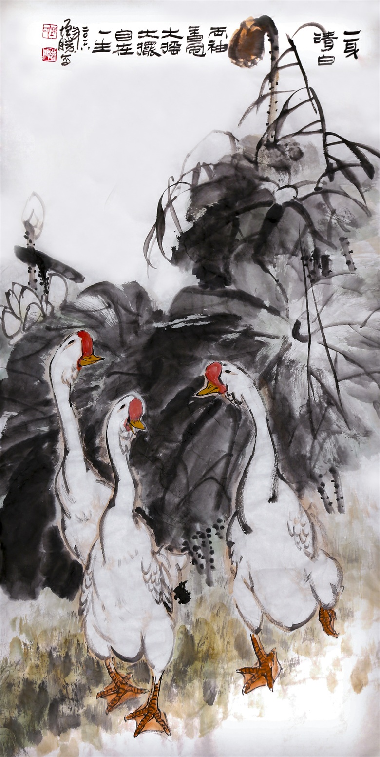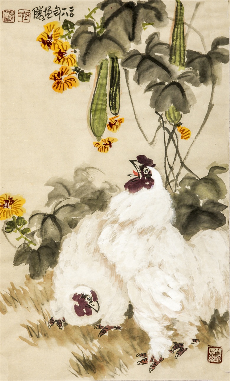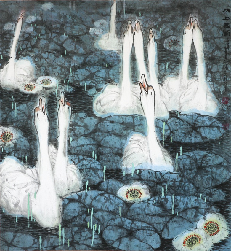 与人物相比,果蔬蝉蝶、花鸟虫鱼更能体现其笔墨造诣,笔、墨、水、色,相交相融,互生互离,老笔如秋风,润墨如春泽,不拘泥常规、不拘常态、不拘常法,而画面有安、有奇,或安、或奇,却不面面具到,更不顾此失彼,而是不雕不琢之际,风神外溢,浑然一体。他若画花,则笔简意足,若画叶,则清脱纯净,若画禽鸟虫鱼,则空而不虚,简而能远,淡而有味,有笔墨构图的意趣、气韵、品格,还有师心独见的提炼、舍取、融合、互通……,从中可以看到娴熟的笔墨功夫,也可以看到现代艺术语言的充分表达。