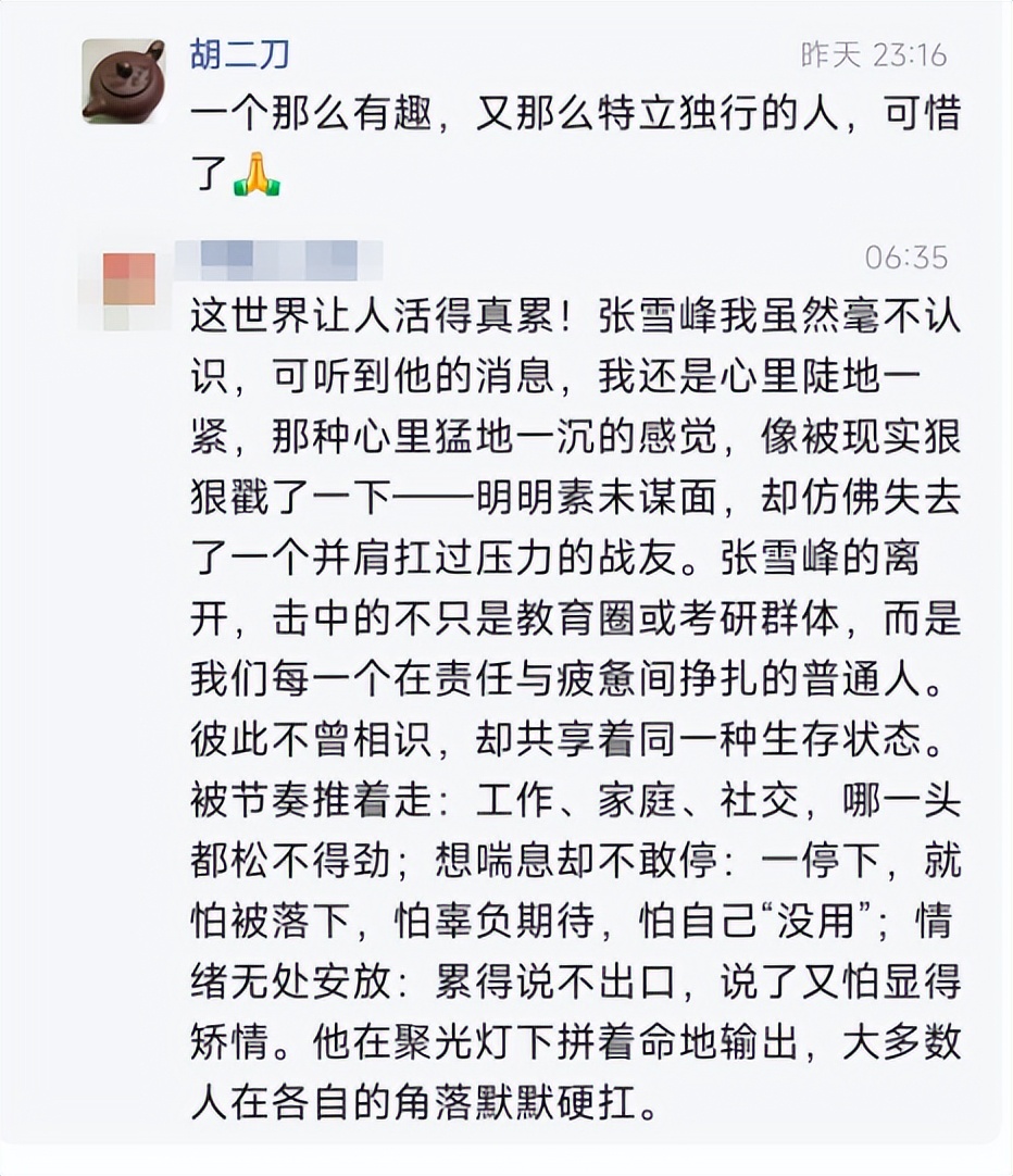 是啊,我们虽然不曾相识,但却仿佛失去了一位同学,一位挚友。张雪峰的价值,在于他用看似粗粝、绝对、充满表演性的表达方式,把复杂的教育问题拉到公共讨论中,让普通人也能参与,更能受益。所以,我们欠张雪峰一个公道。