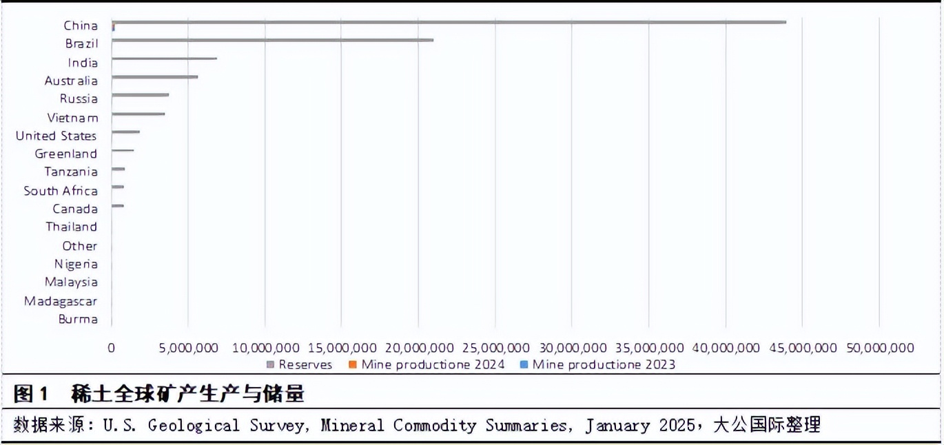 据国内机构《大公国际》发布的产业报告指出,2024年全球稀土总储量超过了9000万吨,中国以4400万吨的储备量位居世界第一,占全球总储量的40%以上,优势明显。在产量上面,全球总稀土产量达39万吨,中国产量27万吨,占全球总产量的69%,依然位居世界第一。