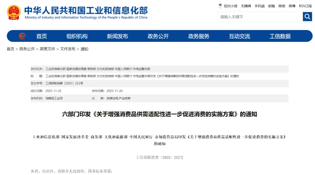 11月26日,工业和信息化部 国家发展改革委 商务部 文化和旅游部 中国人民银行 市场监管总局印发《关于增强消费品供需适配性进一步促进消费的实施方案》。这是二十届四中全会召开后首个印发的关于促消费政策文件。