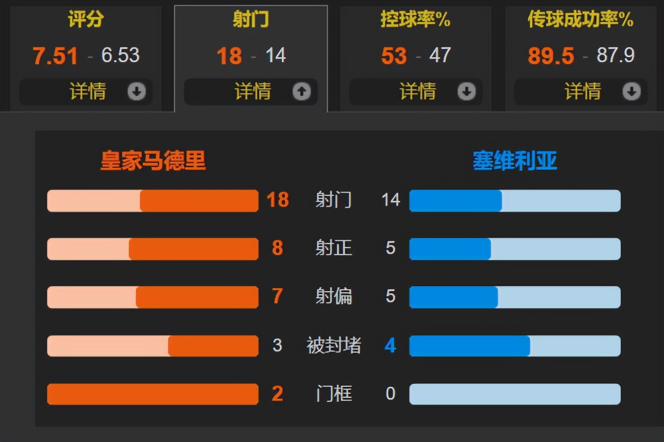 全场比赛,皇马的控球率为53%,一共有18次射门,其中8次射正;塞维利亚一共有14次射门,其中5次射正。皇马首发身价大约是塞维利亚的十来倍,但踢得势均力敌,若皇马遇上势均力敌的对手,阿隆索的战术够呛啊!