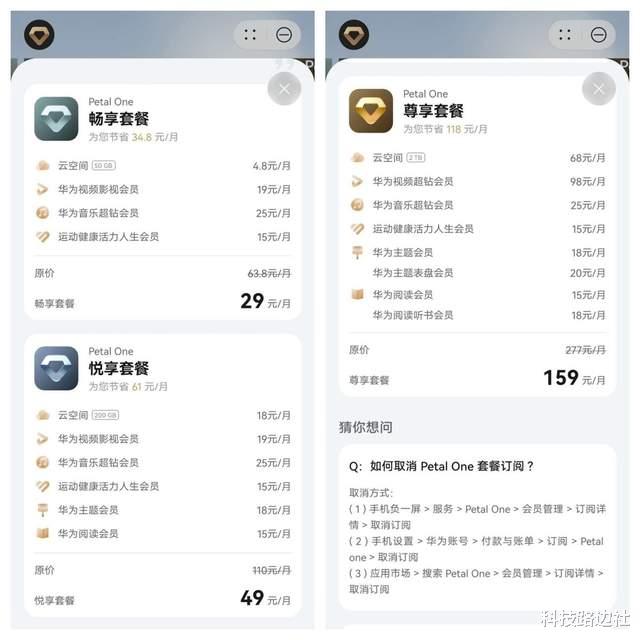 省钱的关键,是Petal One会员套餐,它一共分为畅享、悦享和尊享三个套餐,每个套餐包含的会员权益虽然不一样,但仔细算下来每个套餐都能省下不少的钱。