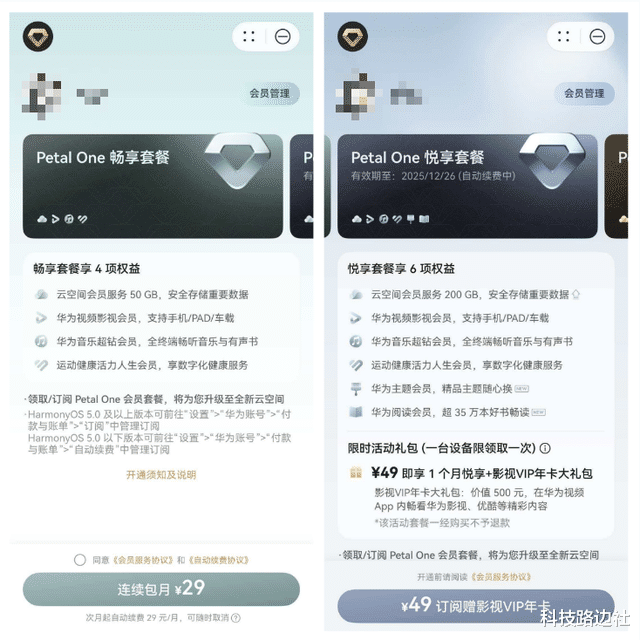 以“悦享套餐”为例,它一站式打包了六大热门服务:云空间(200 GB)、华为影视会员、华为音乐超钻会员、运动健康、主题和阅读会员。单独开通这六项服务,每月总花费原价为110元。而选择Petal One悦享套餐,每月订阅费仅为49元,几乎是低于五折享受全部权益,真的非常划算!