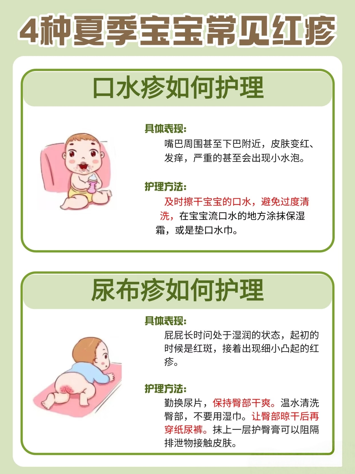 2. 对症护理——口水疹靠隔离,热疹靠降温,尿布疹靠透气,湿疹靠保湿。