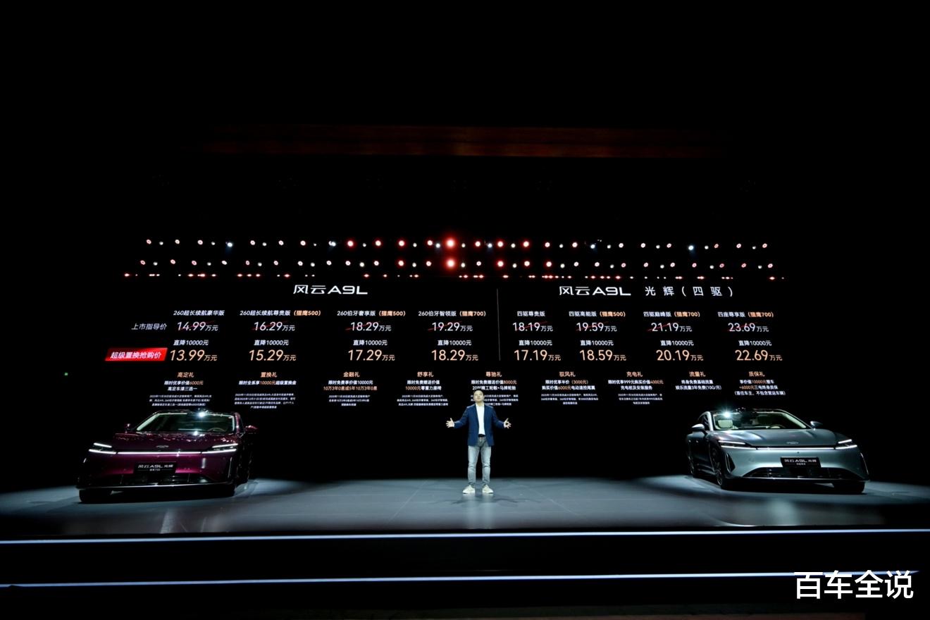 2025年11月15日,"进化"风云A9L光辉(四驱)全球上市发布会在重庆广阳岛国际会议中心隆重举行,本次上市共推出四款版型,正式售价为17.19万元起,共推出四个版本车型,其中四驱尊贵版售价17.19万、四驱高能版(猎鹰500)售价18.59万、四驱巅峰版(猎鹰700)售价20.19万、 四驱尊享版(猎鹰700)售价22.69万。并同步推出"九大购车权益",涵盖高定、置换、金融、舒享、尊驰、驭风、充电、流量、质保多重礼遇,为中国豪华汽车市场再次立下全新标杆。
