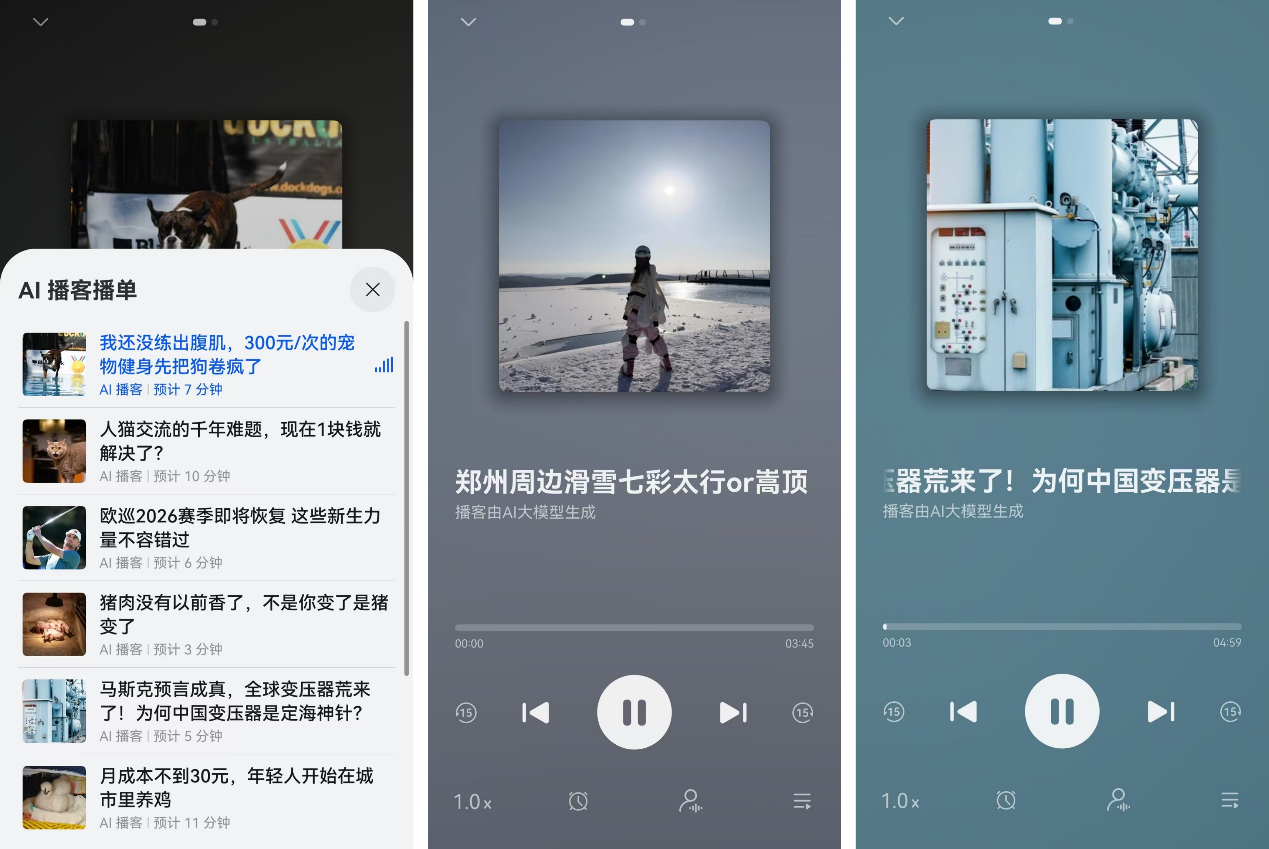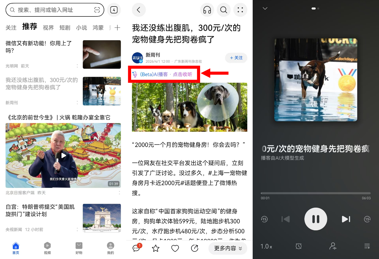 就拿今天早上来说吧,我刷到了一篇《我还没练出腹肌,300元/次的宠物健身先把狗卷疯了》的文章,本来想着大早上脑子转不动,长文肯定看不进去。点了文章顶部的“(Beta)AI播客 点击收听”,几秒钟就生成了6分钟的对谈内容。我边刷牙边听,洗漱完刚好听完,连文章里那些好玩的细节都没落下,比自己逐字逐句看效率高多了。