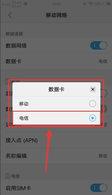4、最后在弹窗数据卡页面,选择要切换的SIM卡网络数据即可了。