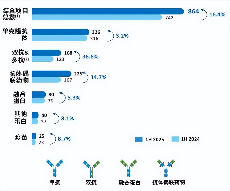 在药明生物一体化平台上,2025年上半年双抗/多抗、ADC项目数量分别增长了36.6%和34.7%,达到168个和225个,增速领跑全平台。同期,平台内所有的新增项目中,双抗/多抗和ADC项目更是占比超过了70%。