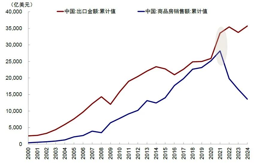 可2021年之后,出口和楼市呈现明确的K型分化。尽管出口在重压之下依然强势,但也无力对冲楼市的巨幅下行。