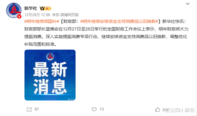 12月27日至28日,全国财政工作会议在北京召开。会议传递出一个明确信号:国家将继续加码消费端的支持措施,特别是在以旧换新、贷款贴息、消费新模式等方面下更大功夫。