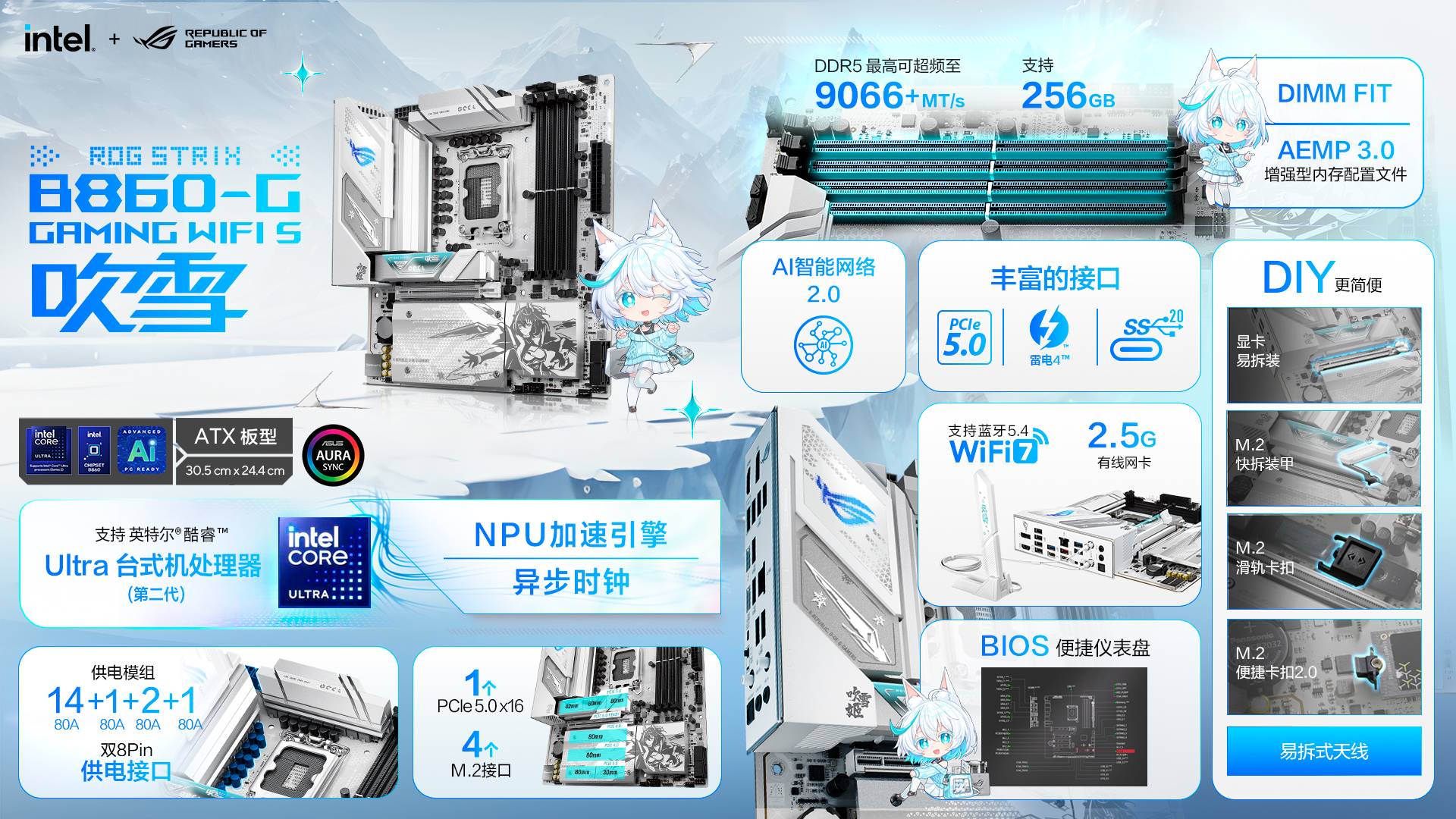 这款 ROG STRIX Z890-A GAMING WiFi S 吹雪主板可谓将“白色信仰+电竞旗舰”进行了很好的融合。本款主板采用 Intel® Z890 芯片组,支持 Intel® Core™ Ultra 系列第2代处理器。在散热装甲、I/O 盖板、PCB 颜色乃至“吹雪”主题元素(如雪武战姬、白色配色)方面均有着较强的视觉识别度。对于追求白色装机/信仰建机的玩家来说,这是一款外观与规格都具备“亮点”的主板。值得强调的是,定位虽是玩家板(STRIX 系列),但在配色与主题上带来了更强烈的个性化定位。