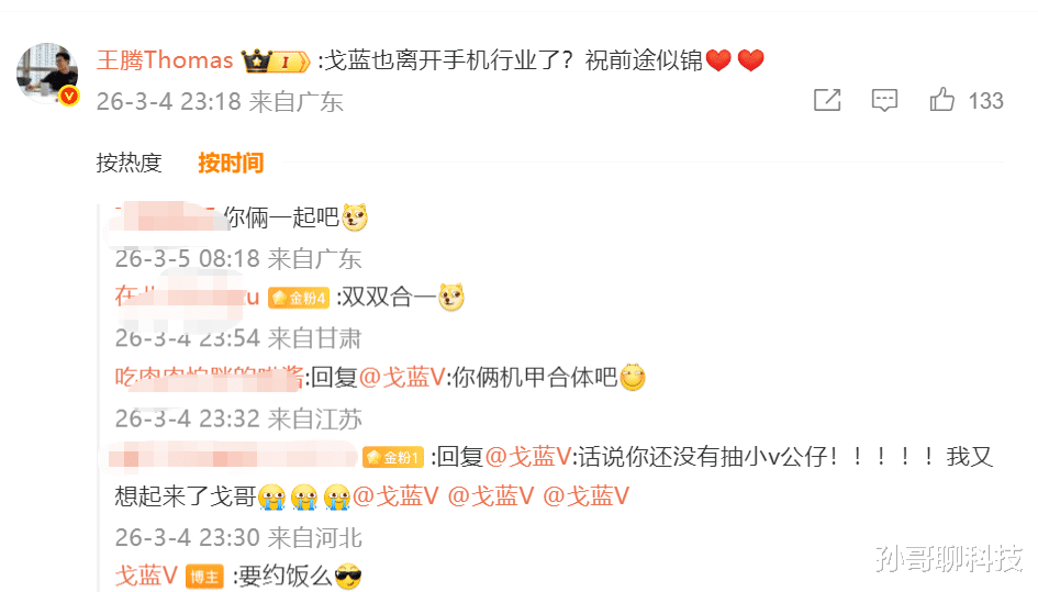 至于戈蓝下一步何去何从,朋友询问会不会去找好朋友王腾?戈蓝否认“不是的”。虽然戈蓝以前是vivo高管,王腾以前是小米高管,两个人私交却非常不错,甚至经常在微博上有互动。去年王腾因为泄密且严重违规遭到小米开除,自己成立一家睡眠相关公司,据说其员工大多来自华为、小米。可见,虽然华为和小米明面上有竞争,但员工私下里可能有不错关系,更何况戈蓝作为vivo前高管,和王腾间两个人保留着不错的私交。