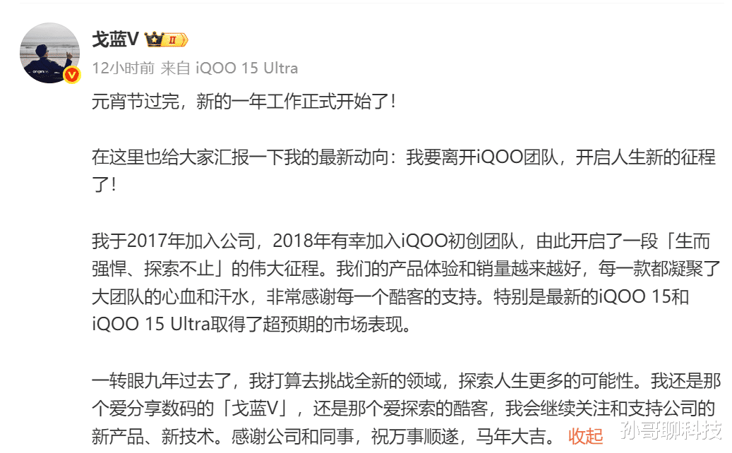 虽然加入vivo品牌不算早,却全程参与iQOO“子品牌”创立。2018年成立初创团队,全程参与第一代iQOO手机研发,可以说是iQOO品牌最重要的灵魂人物。如今元宵节刚过,戈蓝正式宣布离职,让不少网友担心iQOO品牌将来发展,同时也有网友询问其下一步何去何从,难道是加入好朋友王腾的团队?本人对此其实已经做出回应。
