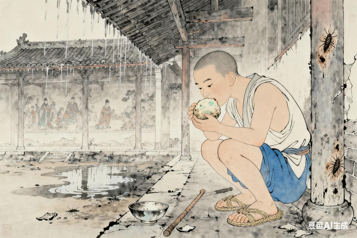 没等他想明白,皇觉寺也断了粮。住持把和尚们都打发出去云游化缘,朱重八背着个小包袱,拿着个破碗,开始了四处漂泊的日子。他走过濠州的乡村,见过饿殍躺在路边,路过的人连眼皮都不抬;他去过徐州的小镇,看见官兵抢老百姓的粮食,女人抱着孩子哭嚎,男人被打得头破血流。有天晚上,他在破庙里过夜,外面下着大雨,庙里漏得四处是水。他蜷缩在墙角,啃着捡来的半块发霉的窝头,听着外面的雨声,忽然想起父母还在时,母亲总会把热乎的糠饼塞给他,那一刻,孤独像潮水一样把他淹没,他抱着膝盖,哭得像个孩子。